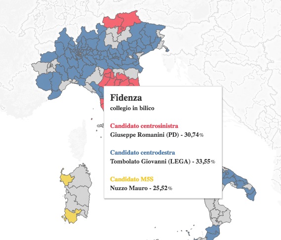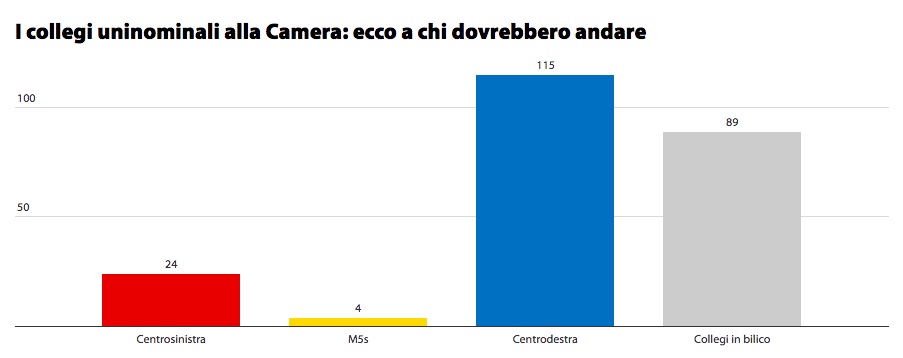 Il sito di Repubblica nazionale ha pubblicato i sondaggi dei collegi uninominali della Camera dei Deputati su tutto il territorio italiano. I risultati attribuiscono un netto vantaggio al centrodestra.