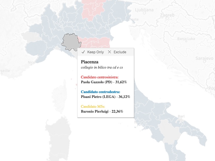 Nel collegio senatoriale di Piacenza, che comprende anche gran parte dei Comuni della provincia di Parma, è invece in vantaggio il centrodestra. Il collegio è classificato come “in bilico”.