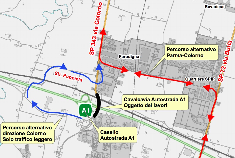 Verrà quindi predisposto opportuno piano di segnalamento che andrà ad identificare il seguente percorso alternativo: I veicoli diretti a nord verso Colorno verranno deviati sulla seguente direttrice: via Europa, tangenziale Nord di Parma direzione Reggio Emilia, uscita svincolo n°2 di via Mantova direzione Nord, via Burla S.P.72 Parma-Mezzani, via Franklin, via Forlanini . I Veicoli provenienti da Nord potranno raggiungere Parma o il casello A1 percorrendo il suddetto itinerario nella direzione opposta.