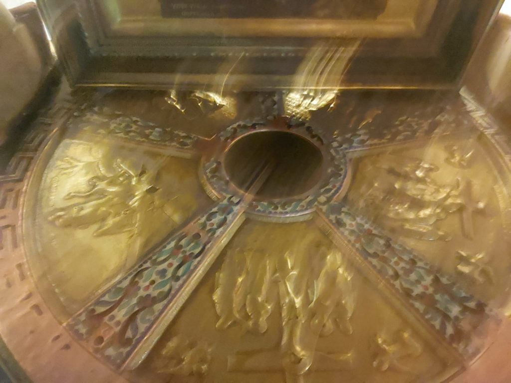 Sulla destra si sale su una scalinata alta 7-8 metri che conduce sulla cima di quello che era il monte del Calvario. In questa parte del Santo Sepolcro, gestito dagli ortodossi con quel loro fastidioso e sfarzoso luccichio di icone d’oro e argento, sotto un altare si trova il punto esatto in cui è stata piantata la croce, con di fianco la roccia del Calvario.