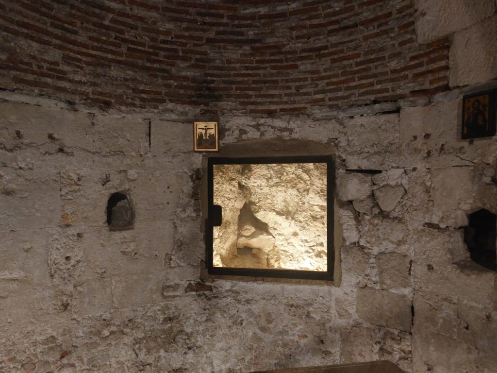 Appena più in là si accede al luogo dove il Risorto apparve alla Vergine Maria, un incontro tra madre e figlio raccontato dai vangeli apocrifi che non ha trovato spazio nel canone ma l’ha trovato nel Santo Sepolcro.