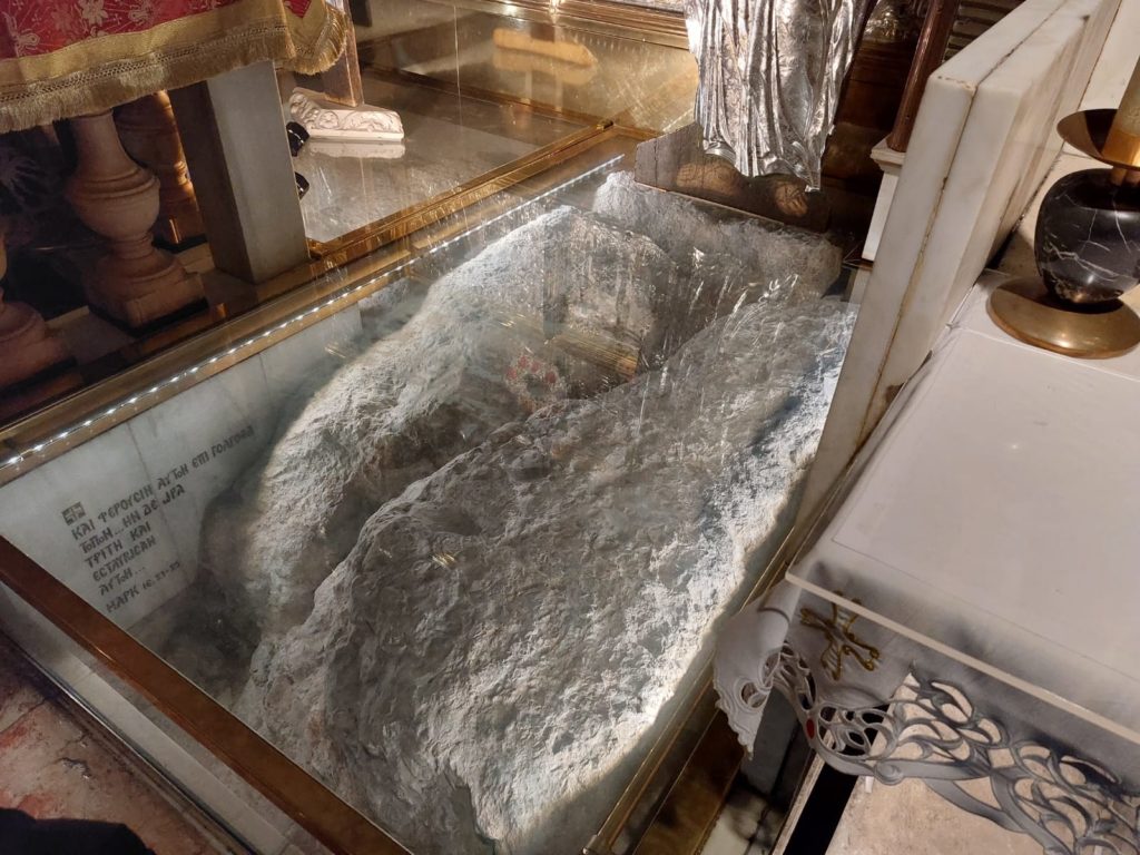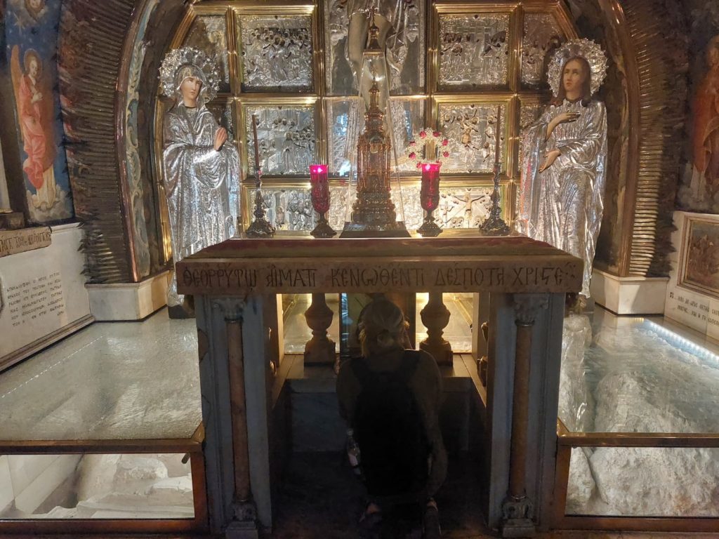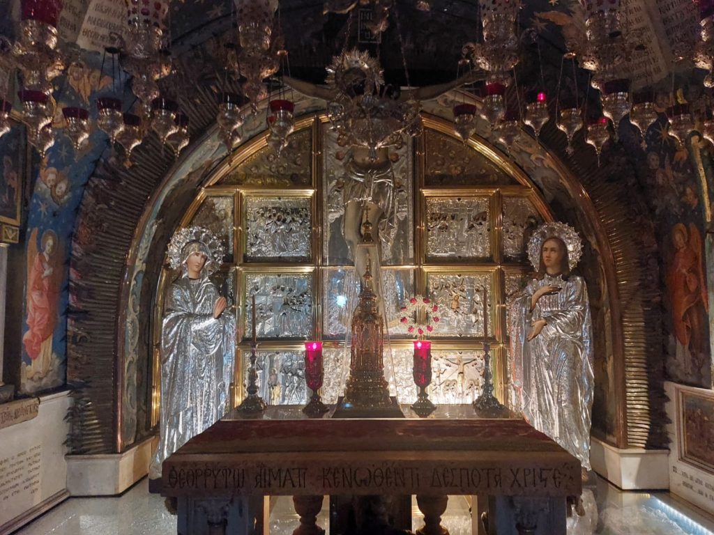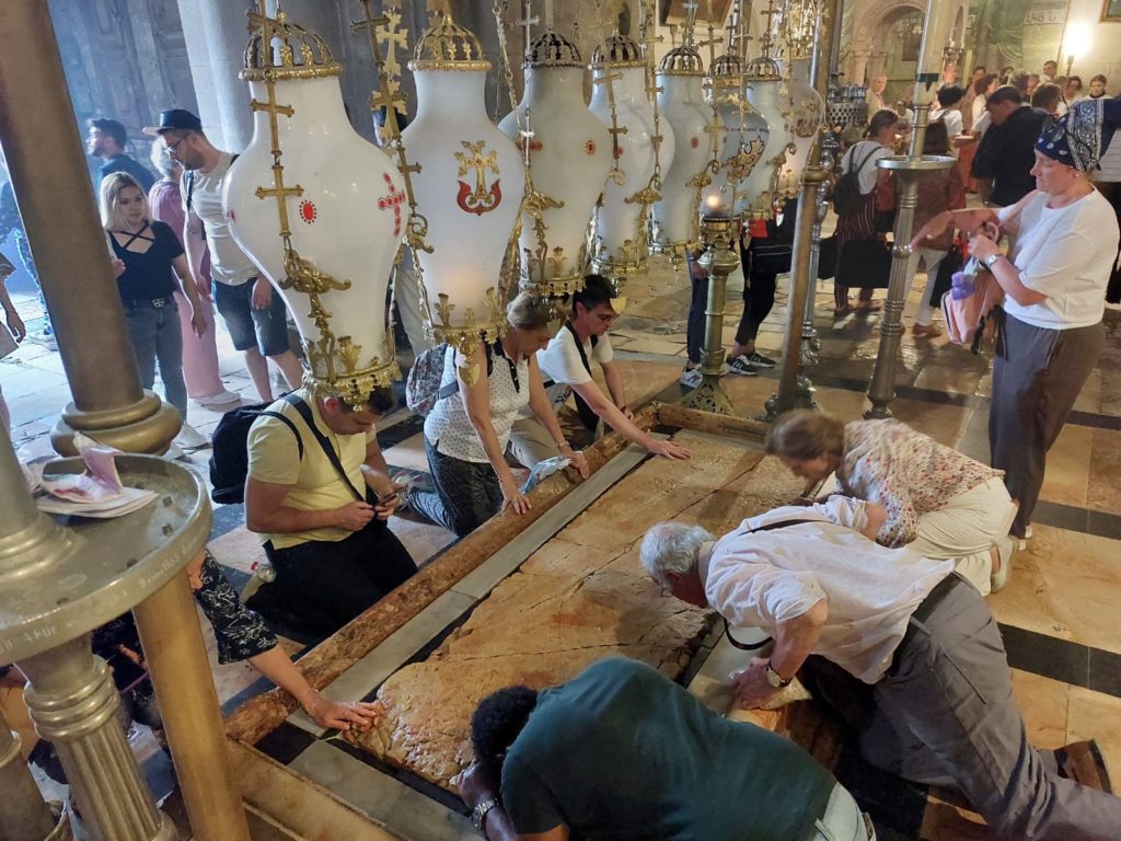 Si entra nel Santo Sepolcro col botto: subito ti trovi davanti a pellegrini prostrati sulla “pietra dell’unzione”, la reliquia sulla quale venne deposto il corpo di Gesù per prepararlo alla sepoltura secondo il rito dei Giudei per volere del discepolo Giuseppe d’Arimatea che chiese e ottenne da Pilato le spoglie del Messia.