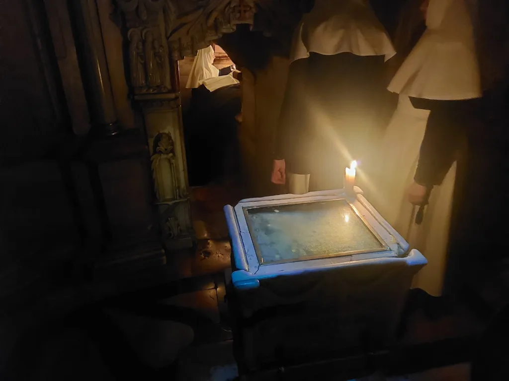 In mezzo all’anticamera c’è la pietra sulla quale era seduto l’angelo “in vesti sfolgoranti” che disse a Maria Maddalena: “Perché cercate tra i morti colui che è vivo? Non è qui, è risuscitato”.