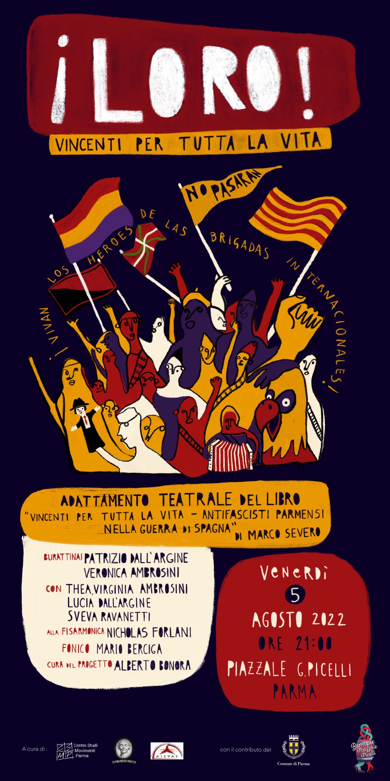 A farli rivivere sarò lo spettacolo teatrale “¡Loro! Vincenti per tutta la vita”, un adattato per burattini e attori del libro di Marco Severo Vincenti per tutta la vita. Antifascisti parmensi nella guerra di Spagna, edito alcuni anni fa (Bfs 2017).