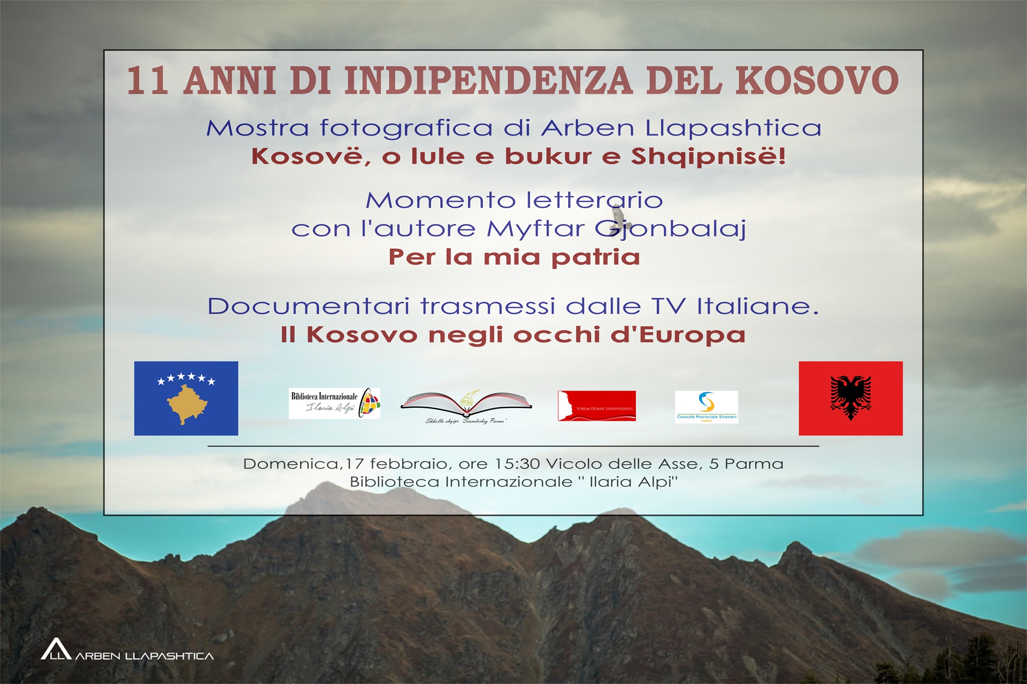 11 anni di indipendenza del Kosovo di UG 15 Febbraio 2019 15 Febbraio 2019 23 Domenica alle ore 15.30 presso la Biblioteca Guanda in vicolo delle Asse 5 a Parma sarà organizzato un evento dedicato al Kosovo. Il Kosovo è un piccolo paese tutto da scoprire con una mostra fotografica e un documentario storico. Seguirà un rinfresco.