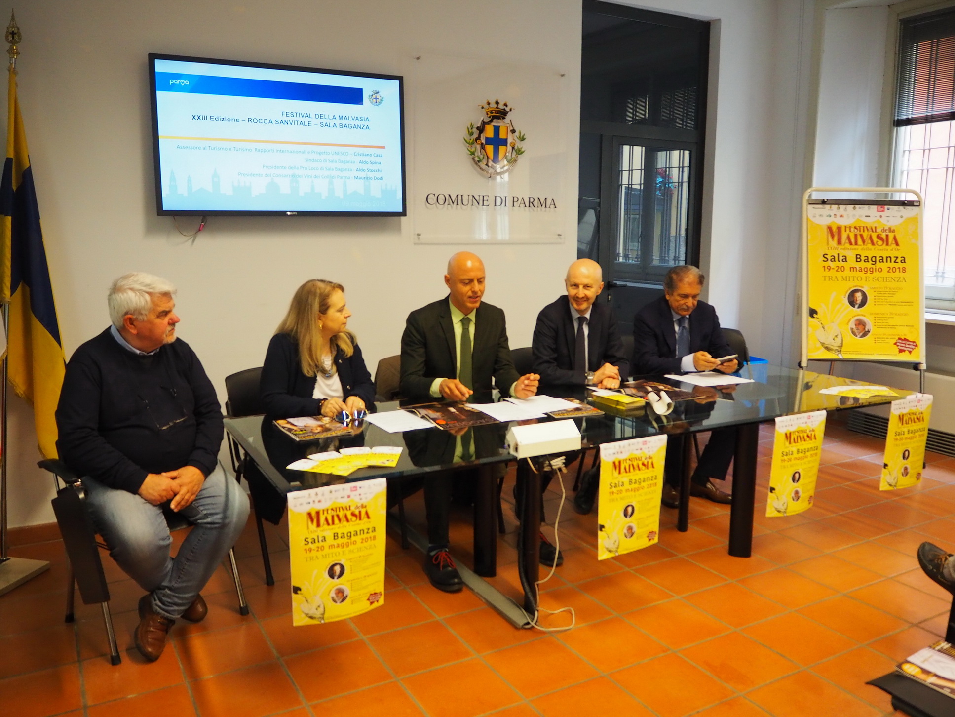 Alla conferenza stampa di presentazione del Festival, che si è svolta nella mattinata di giovedì 10 maggio nella Sala Stampa del Comune di Parma, sono intervenuti l’assessore alle Attività produttive, Commercio e Turismo del Comune di Parma Cristiano Casa, il sindaco di Sala Baganza Aldo Spina con il suo assessore al Turismo Cristina Merusi, il presidente del Consorzio dei Vini dei Colli di Parma Maurizio Dodi e il presidente della Pro Loco di Sala Baganza Aldo Stocchi.