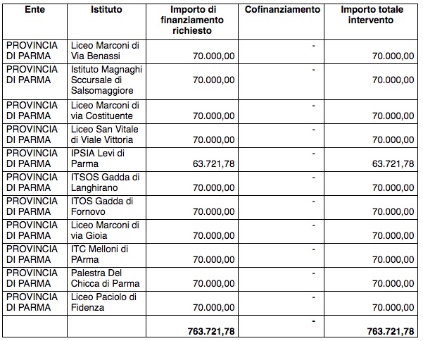 Le scuole finanziate sono il Liceo Marconi di via Costituente, via Benassi e via Gioia, il Liceo Sanvitale di viale Vittoria, l’IPSIA Primo Levi di Parma, l’ITC Melloni, la Palestra Del Chicca di Parma, l’Istituto Magnaghi succursale di Salsomaggiore, l’Istituto Superiore Gadda di Langhirano e di Fornovo e il Liceo Paciolo di Fidenza.