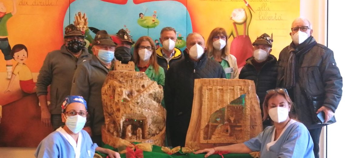 Ma l’Ospedale dei bambini si sviluppa su tre piani, oltre a quello a piano terra e quindi Gianni Rodolfi ha cercato un tronco adatto allo scopo ed ha iniziato a dar corso alla passione che coltiva da oltre vent’anni, intagliare il legno. Dalle sue mani è uscito un altro presepe che ha consegnato al personale e alle coordinatrici infermieristiche dei reparti pediatrici Giuseppina Nicosia e Claudia Marcatili. Ad aiutarlo in questo suo lavoro il Gruppo Alpini di Collecchio Gaiano di cui lui fa parte e che omaggia con opere dedicate rappresentato da Luciano Balduzzi e Parma Partecipazioni Calcistiche che detiene l’1% del pacchetto azionario del Parma Calcio, presente con il vicepresidente Giancarlo Mandelli. Per il Gruppo Alpini sezione di Parma erano presenti Alide Rodolfi, Ezio Lanci e Massimo Guarenghi.