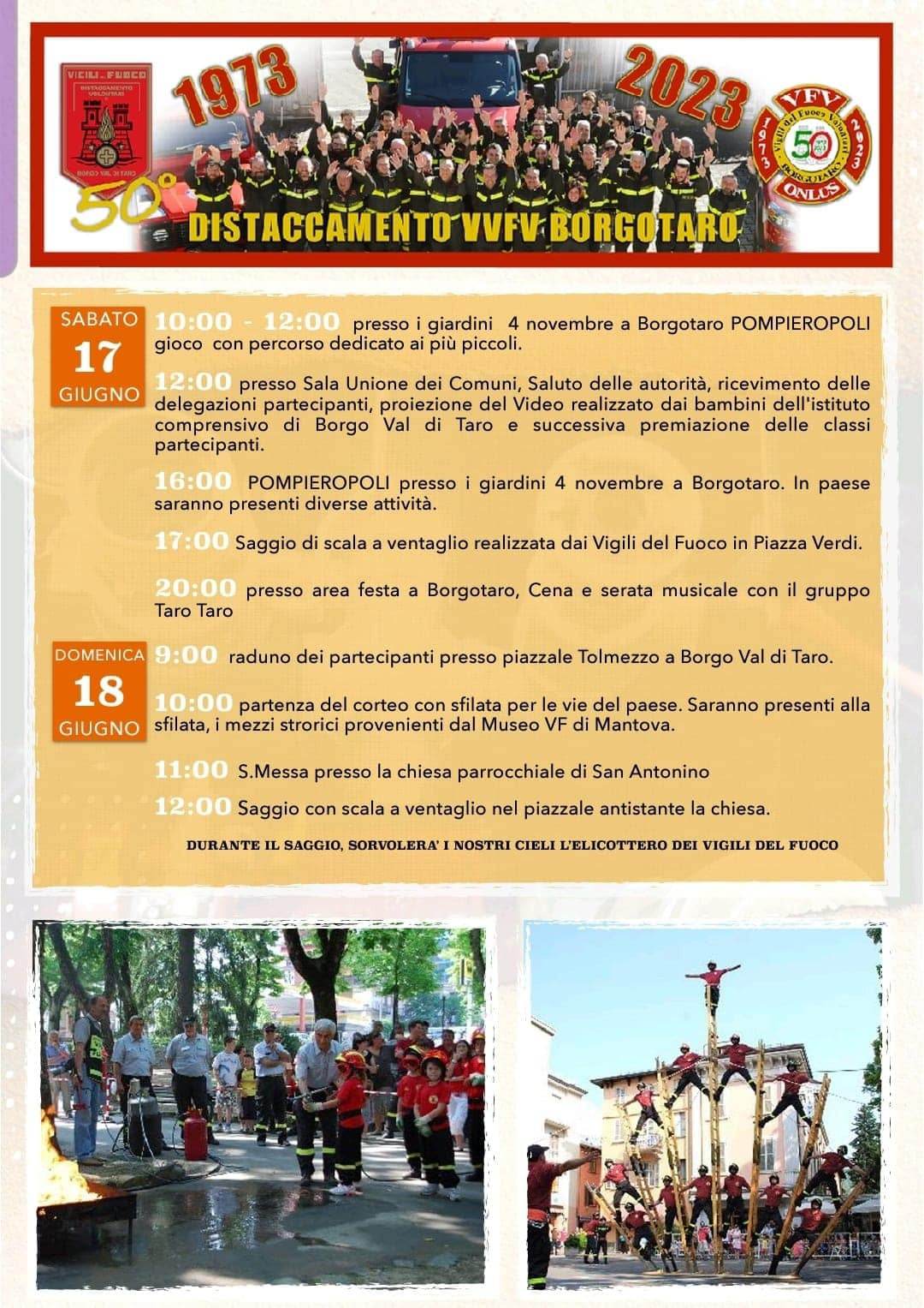 A partire da domani (17 giugno) e per tutto il fine settimana saranno numerose le iniziative per il 50° anniversario di fondazione del Distaccamento Volontario dei Vigili del Fuoco di Borgo Val di Taro.