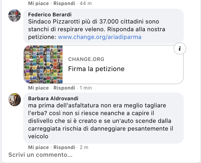 Lunedì 10 maggio Change.org ha lanciato un FB “bombing” sul profilo del Sindaco di Parma Federico Pizzarotti verso le ore 17 ma sistematicamente i commenti venivano cancellati. Ad oggi ne sono rimasti solo 3. A fine giornata Facebook ha bloccato la pagina della Campagna di sensibilizzazione sulla qualità dell’aria per ragioni ancora oscure.