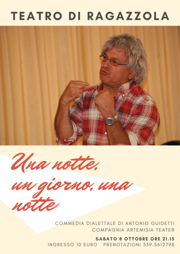Comincia il 7 dicembre del 1979 l’avventura di Antonio Guidetti nel teatro, quando insieme ad alcuni amici fonda il Teatro del Forno (così chiamato perché le prove venivano realizzate in un forno dove, ad una certa ora, i nostri amici venivano gentilmente pregati di andarsene perché qualcuno doveva incominciare a sfornare il pane). Arriva poi a frequentare la scuola “Nuova Scena” di Bologna diretta da Alessandra Galante Garrone e agli inizi degli anni ’90 fonda la Compagnia “Artemisia Teater”, la più apprezzata compagnia dialettale di Reggio Emilia, di cui ancora oggi è “capocomico”. In oltre trent’anni di teatro dialettale, Guidetti ha realizzato più di sessanta fra commedie, monologhi, farse e cabaret. Trent’anni di teatro fatto con passione e devozione, sempre con la stessa voglia e lo stesso entusiasmo di creare spettacoli di puro divertimento. Come quello che andrà in scena al Teatro di Ragazzola, sabato 8 ottobre, alle 21.15 dal titolo “Una notte, un giorno, una notte”.