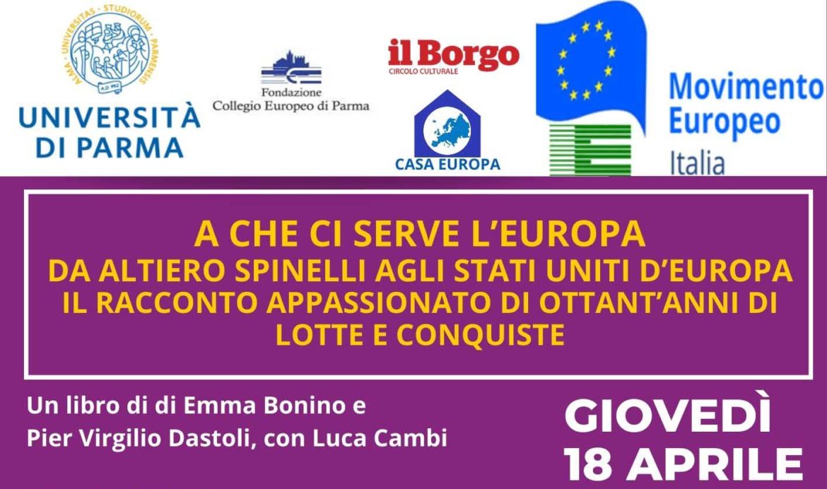 L’incontro – aperto al pubblico – è promosso da Università di Parma, Movimento Europeo Italia, Fondazione Collegio europeo di Parma e da Casa Europa del Circolo “Il Borgo”, in collaborazione con Movimento federalista europeo (sez. di Parma), Tutti (Europa VentiTrenta), Associazione Mazziniana Italiana e da Università Popolare di Parma.