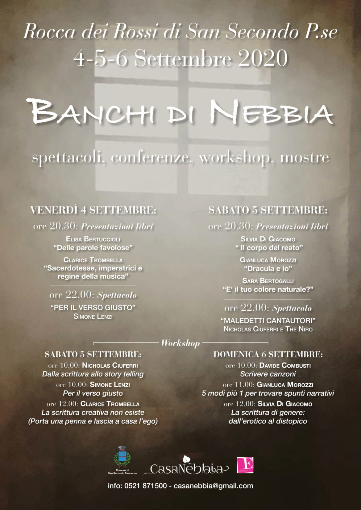 Al proposito, la dott.ssa Elisa Bertuccioli, dell’Ufficio turistico di San Secondo, ha dichiarato: “Nonostante il periodo difficile che tutti, e le istituzioni culturali nello specifico, stanno vivendo, abbiamo comunque deciso di portare avanti seppur in formato ridotto un’iniziativa che l’anno scorso è stata molto apprezzata e partecipata. Non volevamo e non potevamo interrompere un progetto ambizioso e di altissima qualità che per poter continuare a dare buoni frutti necessita di cure costanti. In questi mesi noi abbiamo continuato a coltivare e dunque siamo lieti di annunciare l’evento Banchi di Nebbia, che si svolgerà presso la Rocca dei Rossi dal 4 al 6 settembre 2020 e che sarà ricco di proposte: dalle presentazioni di libri ai workshop agli spettacoli. Si aggiungerà anche una mostra, di cui vi daremo a breve maggiori informazioni. Come immaginabile, quest’anno la prenotazione agli eventi sarà indispensabile per ottemperare alle norme relative al distanziamento sociale”.