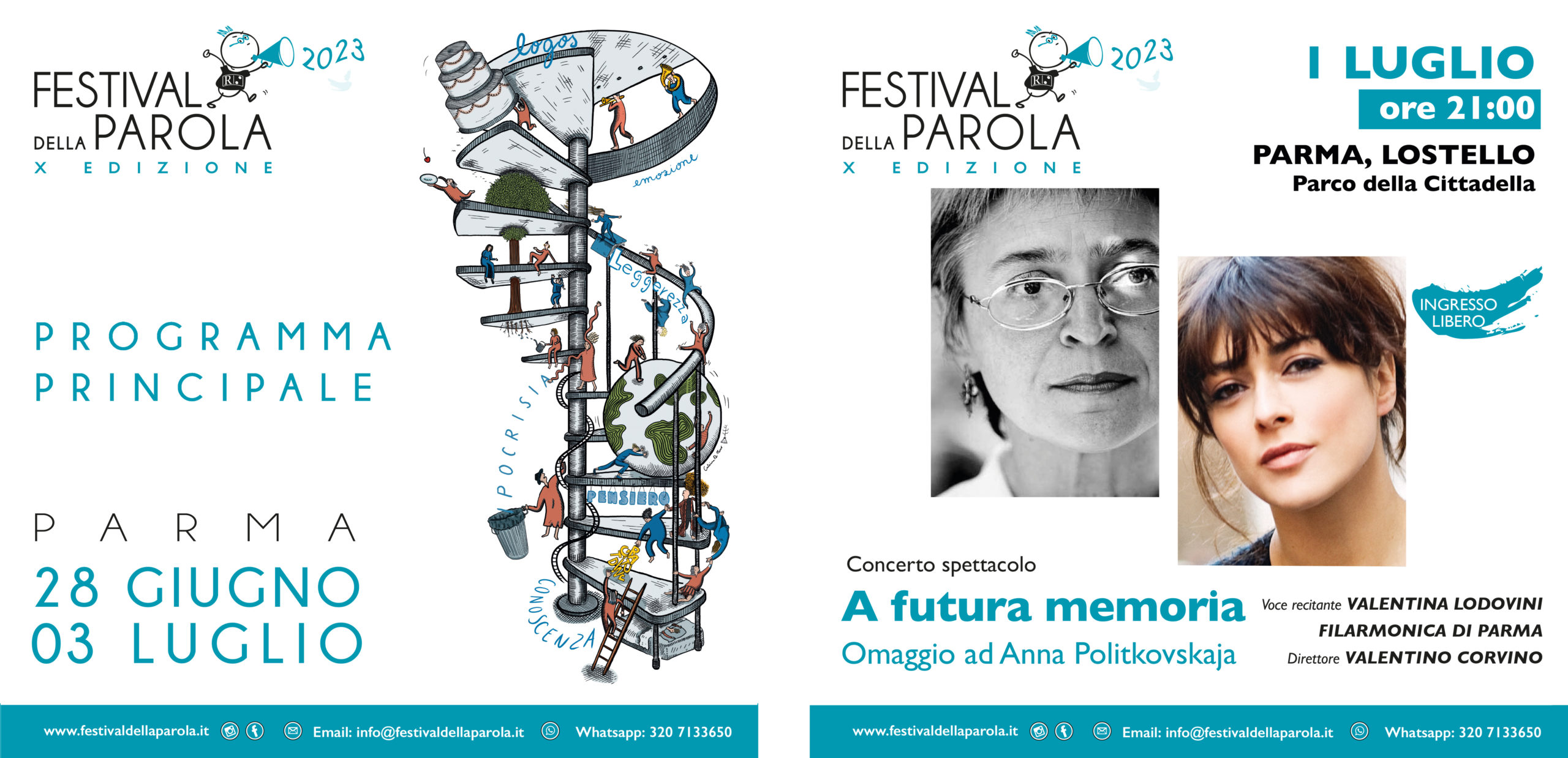Sabato 1° luglio, a Lostello nel Parco della Cittadella, alle ore 21 Il festival dà la parola a… EMC 2, con PAOLO LOMMI (responsabile servizi socio educativi). Alle ore 21.15 lo spettacolo-concerto “A futura memoria. Omaggio ad Anna Politkovskaja”, voce recitante VALENTINA LODOVINI, con la FILARMONICA DI PARMA, diretta da VALENTINO CORVINO, aurtore del progetto artistico.