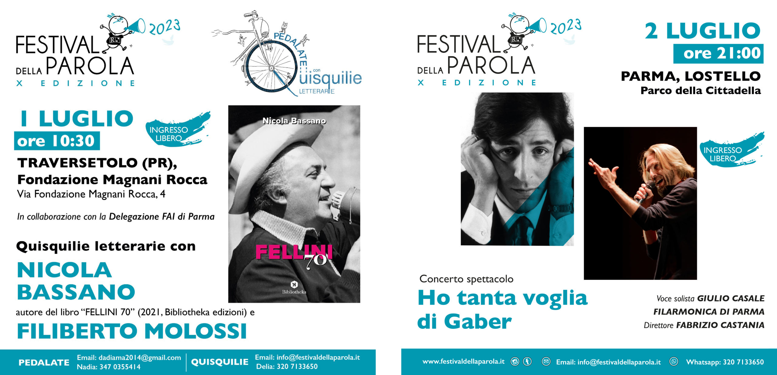 L’ultimo appuntamento della rassegna delle PEDALATE CON QUISQUILIE LETTERARIE è in programma sabato 1° luglio alla Fondazione Magnani Rocca di Mamiano diTraversetolo, dove alla ore 10.30 sarà possibile assistere all’incontro tra Nicola Bassano, autore del libro “Fellini 70” (2021, Bibliotheka edizioni) e Filiberto Molossi, giornalista e scrittore.