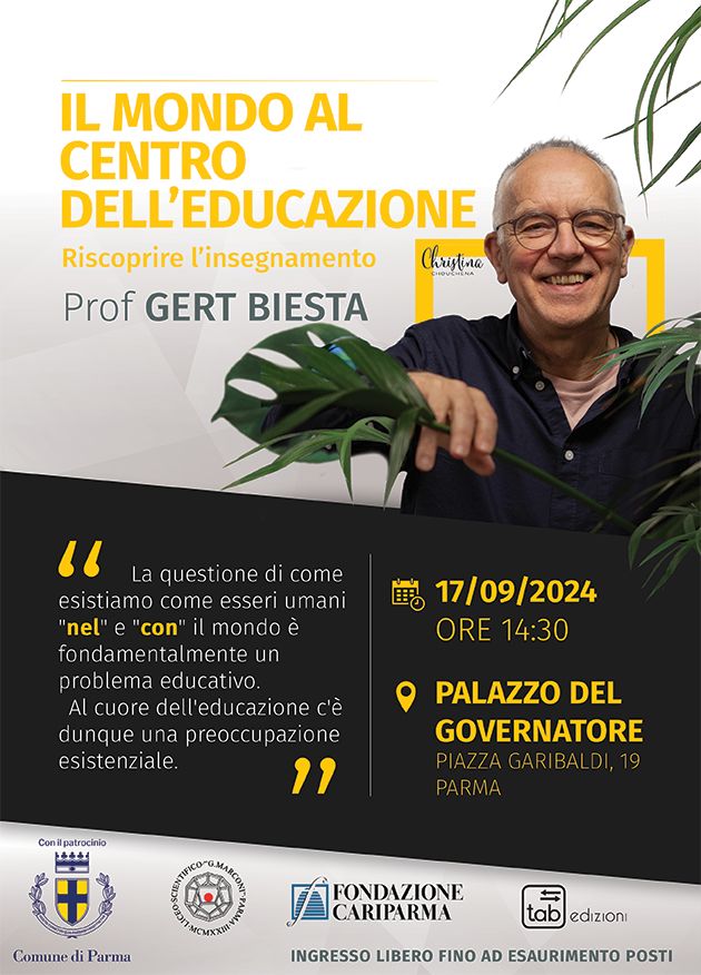 Cosa manca nel discorso e nella pratica educativa contemporanea? La complessità degli aspetti che compongono oggi la realtà dell’educazione verrà indagata martedì 17 settembre 2024, a partire dalle ore 14.30, a Palazzo del Governatore in occasione di un evento di eccezionale portata culturale per la città, organizzato dal Liceo Guglielmo Marconi di Parma: la lezione-conferenza del prof. Gert J.J. Biesta, uno tra i più illuminati pedagogisti e filosofi dell’educazione, già professore di Public Education presso il Centre for Public Education and Pedagogy dell’Università di Maynooth, in Irlanda, e professore di Educational Theory and Pedagogy all’Università di Edimburgo, nonché autore di testi chiave sul tema della formazione e dell’educazione.
