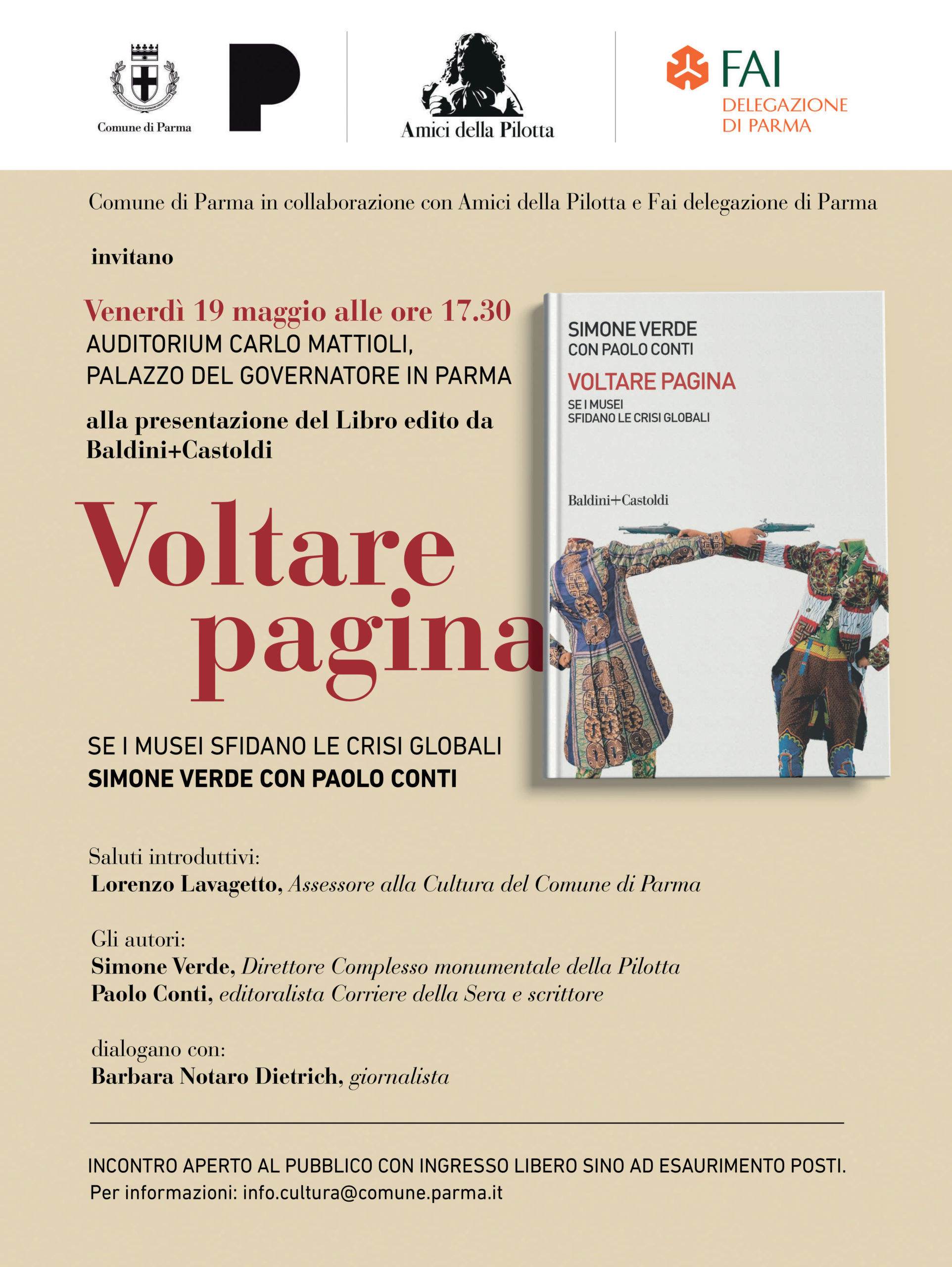 Venerdì 19 maggio, alle 17.30, all’Auditorium Carlo Mattioli di Palazzo del Governatore, si terrà la presentazione del volume “Voltare pagina. Se i musei sfidano le crisi globali”, scritto da Simone Verde e Paolo Conti (Baldini+Castoldi, 2022), alla presenza di entrambi gli autori che dialogheranno con la giornalista Barbara Notaro Dietrich.