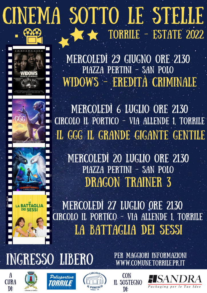 “Il cinema è magia – dichiarano il sindaco di Torrile Alessandro Fadda e l’assessora Lucia Frasanni – ancor di più quest’anno con la riproposizione delle proiezioni serali dei film, dopo due anni di stop causa pandemia, che consentiranno di tornare ad incontrarsi nei nostri paesi e condividere momenti di comunità. Abbiamo pensato ad un calendario variagato con proposte per tutte le età al fine di coinvolgere tutti i nostri cittadini. Ringraziamo tutti coloro – associazioni, volontari e sponsor – che rendono possibili questi quattro appuntamenti”.