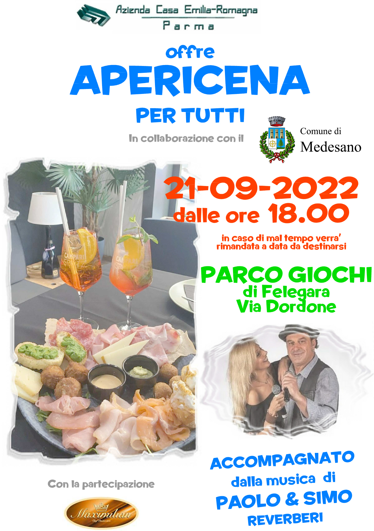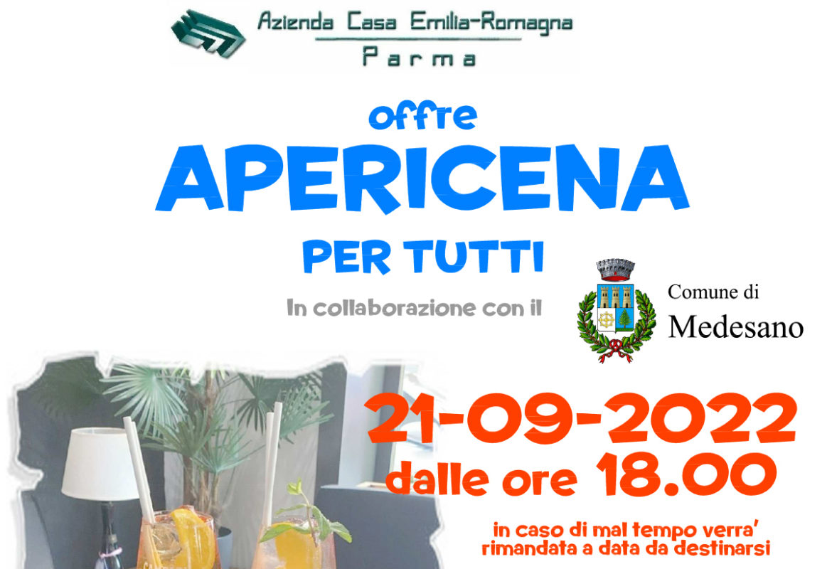 Dopo la grande partecipazione e il successo dell’iniziativa che a luglio ha coinvolto gli inquilini degli edifici gestiti da Acer Parma e tanti residenti e villeggianti del Comune di Berceto, si rinnova in un’altra zona della provincia di Parma, sulla Pedemontana, l’appuntamento “Apericena per tutti”: nel Comune di Medesano, a partire dalle 18 di mercoledì 21 settembre, all’interno del parco giochi di via Dordone della frazione di Felegara, si svolgerà infatti un momento di socializzazione “gemello”, pensato per coinvolgere tutta la cittadinanza e le circa duecento persone che abitano nei dodici edifici gestiti dall’Azienda Casa tra Ramiola, Medesano, Sant’Andrea, Varano dei Marchesi e Felegara.