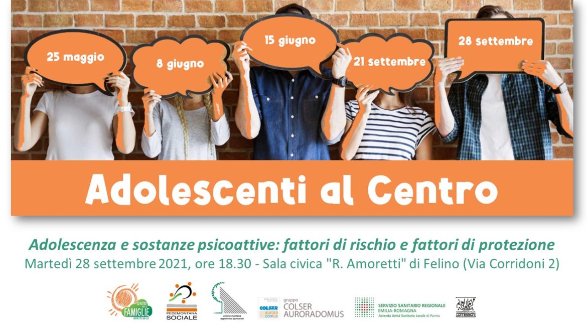 “Adolescenti e sostanze psicoattive: fattori di rischio e fattori di protezione” è il titolo del quinto e ultimo appuntamento di “Adolescenti al Centro”, che si svolgerà nella Sala Civica “Remigio Amoretti” di Felino (Via Corridoni, 2) alle 18.30 di martedì 28 settembre.