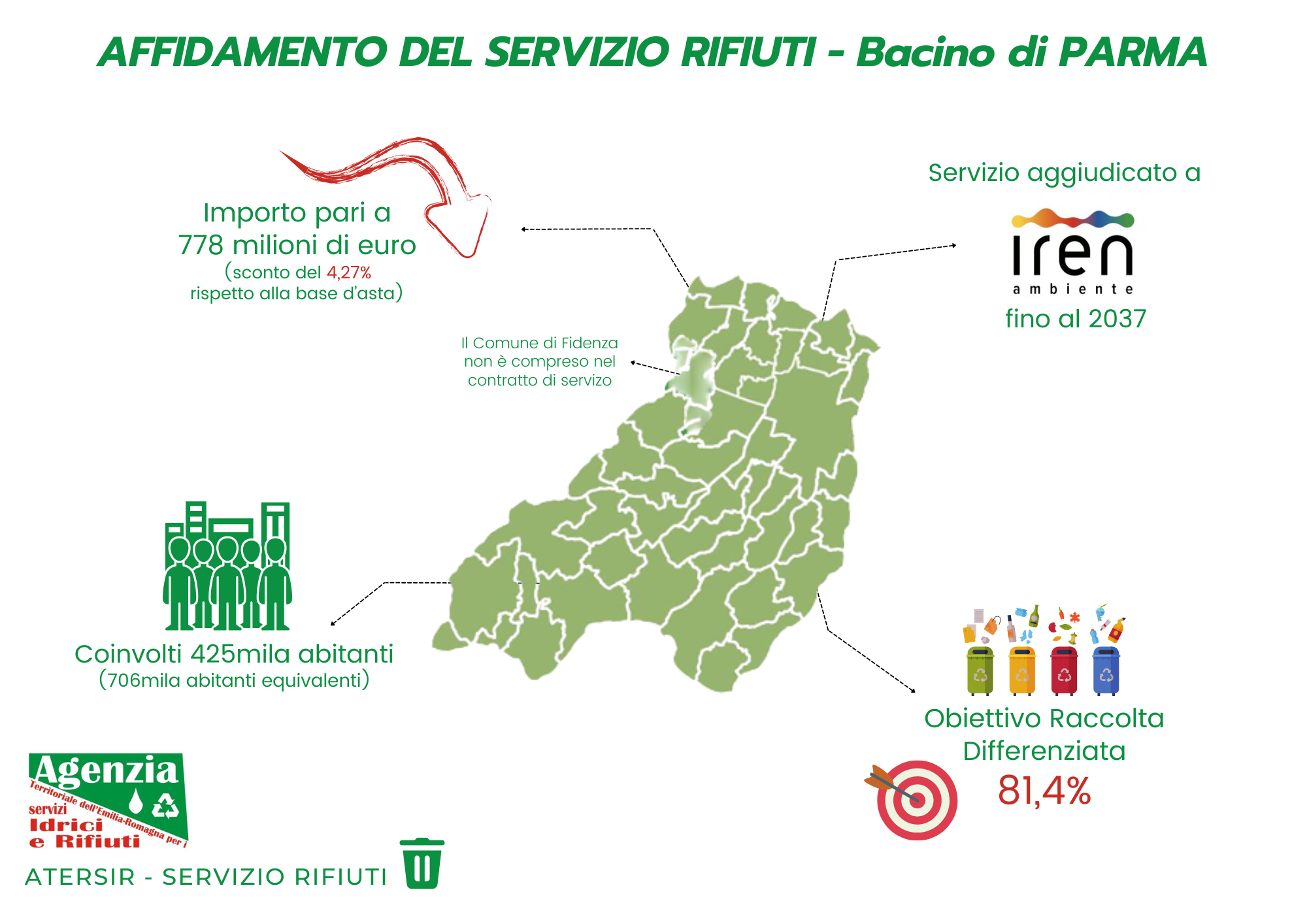Nel bacino di Parma l’affidamento riguarda 43 comuni* che comprendono il capoluogo e tutti i comuni ad esclusione di Fidenza (dove opera il gestore pubblico in house San Donnino Multiservizi); l’importo totale della concessione posta a base di gara è pari a 813 milioni di euro ed è stata aggiudicata al soggetto vincitore con uno sconto del 4,27%, con un risparmio per il territorio di oltre 34 milioni nei quindici anni.