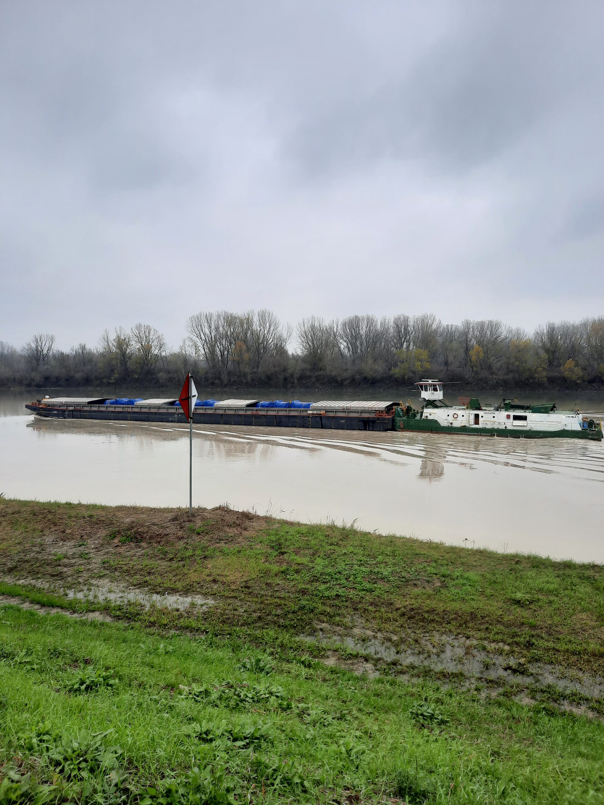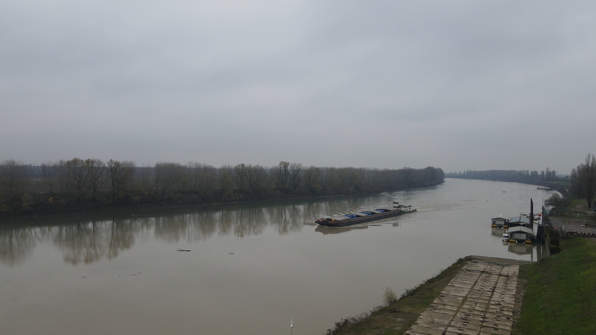 Nelle immagini, transita di fronte agli uffici AIPo di Boretto una chiatta della ditta Fagioli S.p.A. in direzione del porto di Cremona.