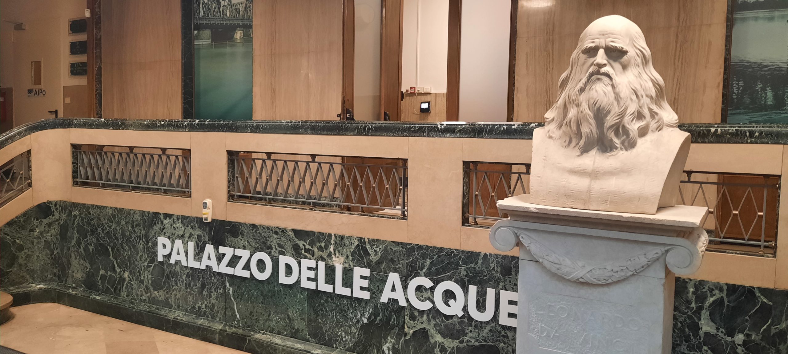 La riproposizione della sua effige nell’ampio e luminoso atrio d’ingresso, oltre a renderne possibile la visione anche dall’esterno e da parte di visitatori, assume anche un valore di ispirazione per chi all’interno della sede di barriera Garibaldi lavora ogni giorno per l’efficace gestione dei corsi d’acqua.