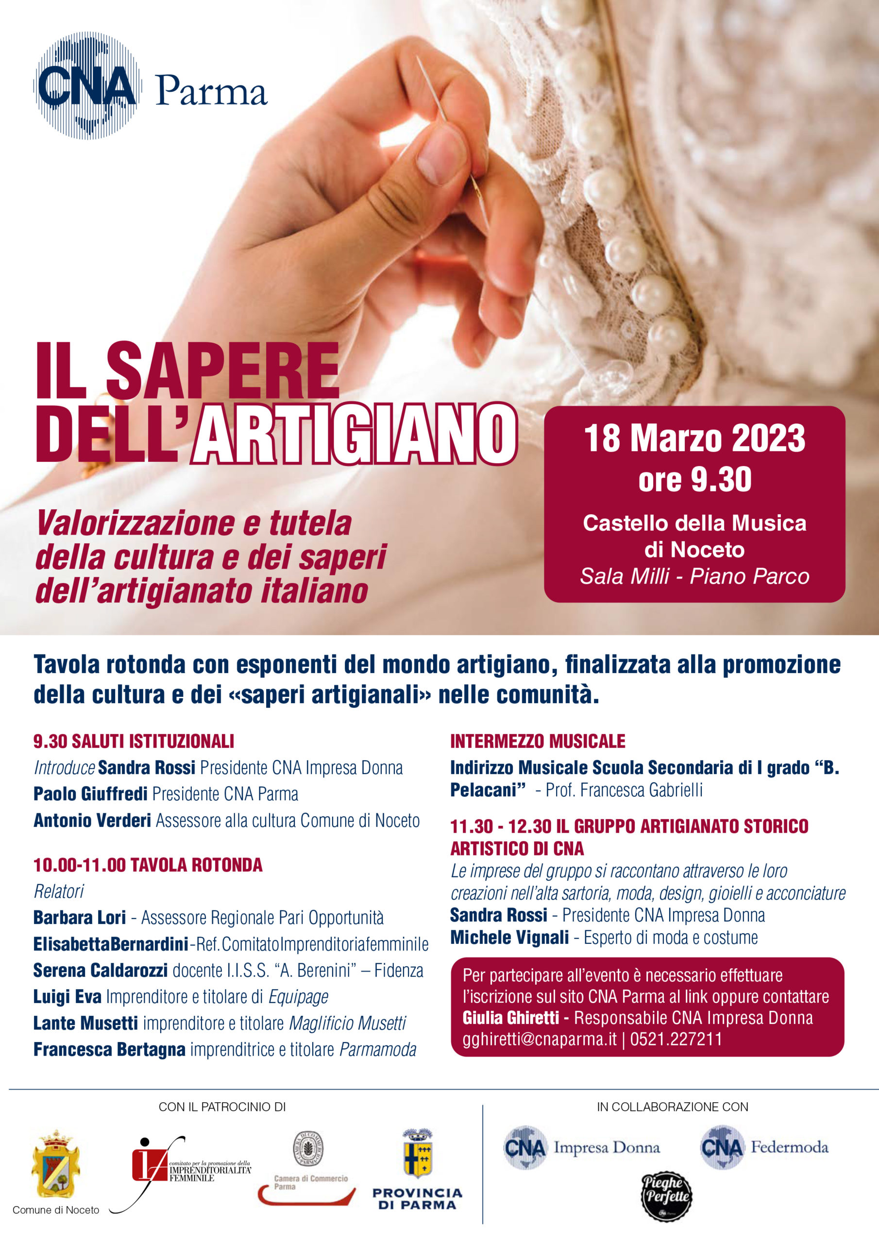 Si terrà il prossimo Sabato 18 Marzo, alle 09.30, al Castello della Musica di Noceto, sul tema “Il saper fare dell’artigiano”, organizzato da CNA Impresa Donna di Parma con il Patrocinio del Comune di Noceto, la Camera di Commercio di Parma, il Comitato Imprenditoria Femminile, la Provincia di Parma e in collaborazione con CNA Federmoda e il Gruppo CNA “Pieghe Perfette.