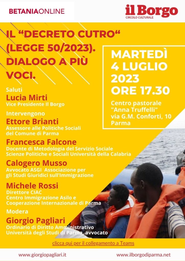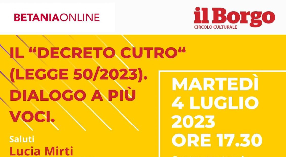 – Si svolgerà oggi pomeriggio (martedì 4 luglio) alle ore 17.30, presso il centro pastorale “Anna Truffelli” (seminario minore), in via G.M. Conforti 10, l’incontro – aperto al pubblico – dal titolo “Il Decreto Cutro (Legge 50/2023). Dialogo a più voci”, promosso dal Circolo il Borgo e da Betania online. L’incontro, che verrà aperto dai saluti di Lucia Mirti, Vice presidente del Borgo, costituirà l’occasione per approfondire dal punto di vista legislativo le diverse modifiche apportate dalla legge in materia di immigrazione e di protezione internazionale, con l’Avvocato Calogero Musso dell’associazione per gli studi Giuridici sull’immigrazione (ASGI).