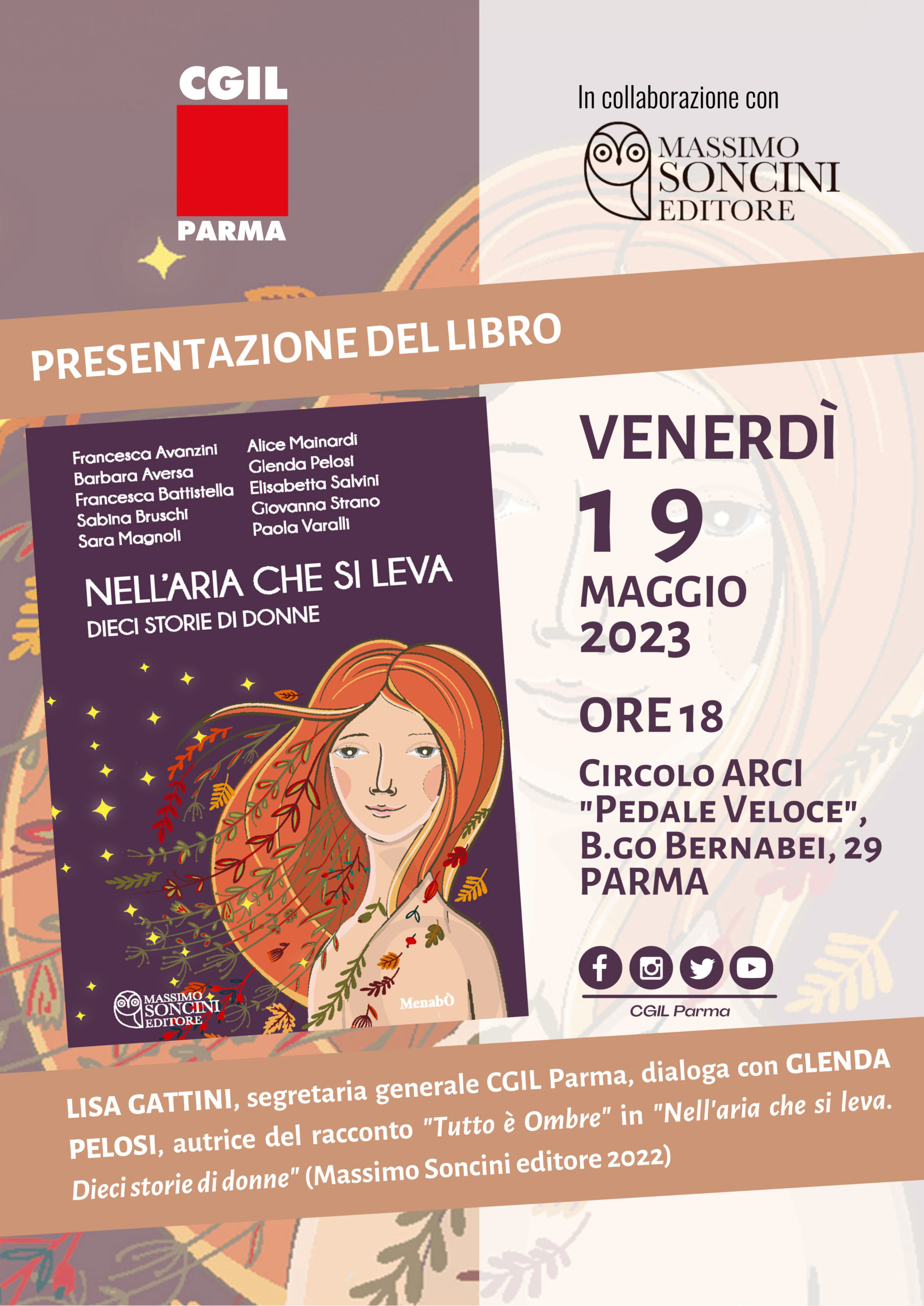 La CGIL Parma, in collaborazione con Massimo Soncini editore, è lieta di invitare la cittadinanza, il prossimo venerdì 19 maggio, alle ore 18, alla presentazione del libro “NELL’ARIA CHE SI LEVA. Dieci storie di donne”, che si svolgerà al Circolo ARCI “Pedale Veloce”, in B.go Bernabei, 29 a Parma.