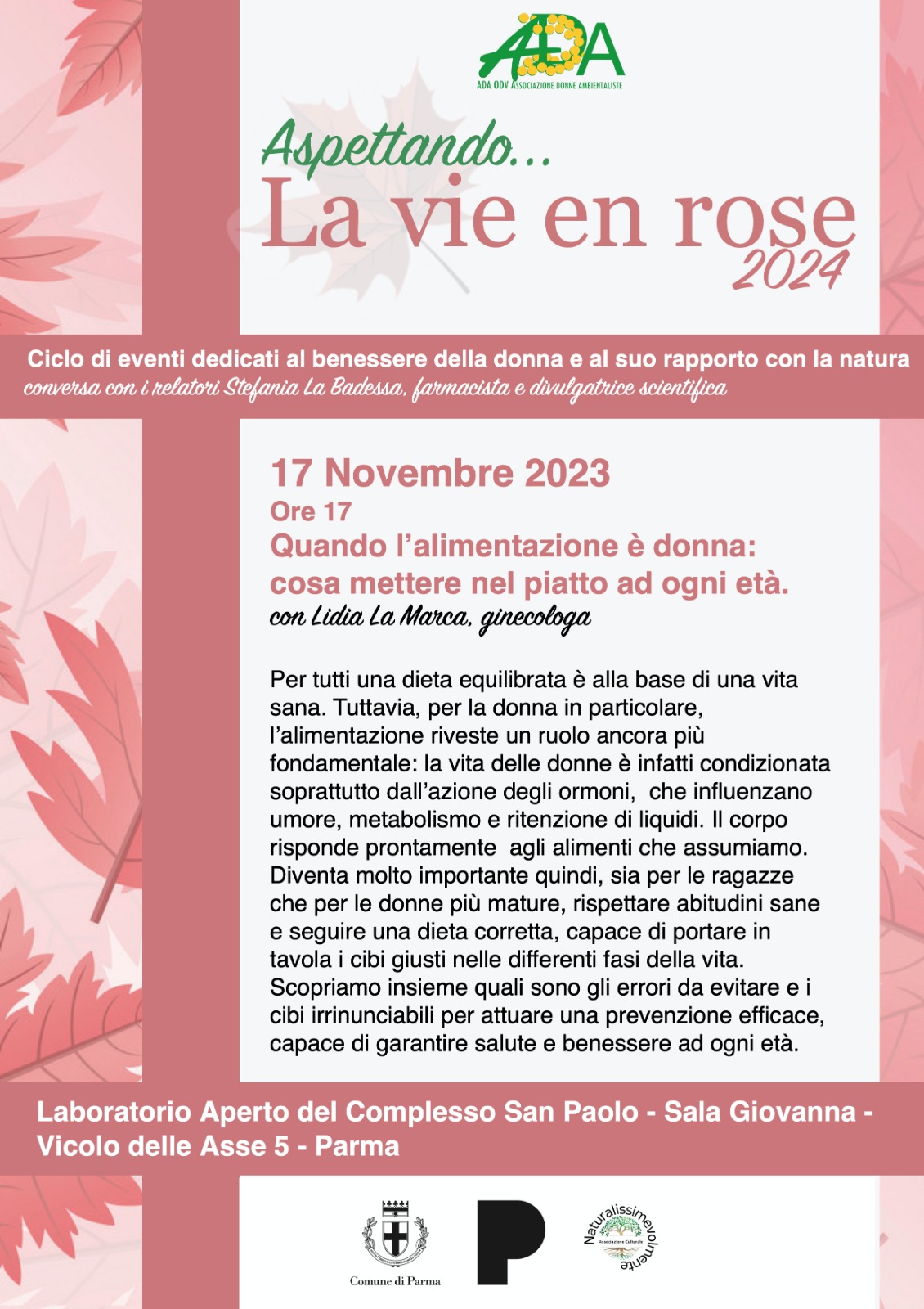 Venerdì 17 novembre alle ore 17 a Laboratorio Aperto del Complesso San Paolo, in vicolo delle Asse 5 a Parma, ADA associazione donne ambientaliste invita tutta la cittadinanza all’incontro Quando l’alimentazione è donna:cosa mettere nel piatto ad ogni età con Lidia La Marca, ginecologa, autrice di numerose pubblicazioni di divulgazione medica, tra cui Dottor Cibo, manuale pratico-scientifico sulle nuove basi della nutrizione, La vita più avanti, guida al benessere della terza età, Libere di stare bene, dedicato alla salute della donna (Edizioni ADV)