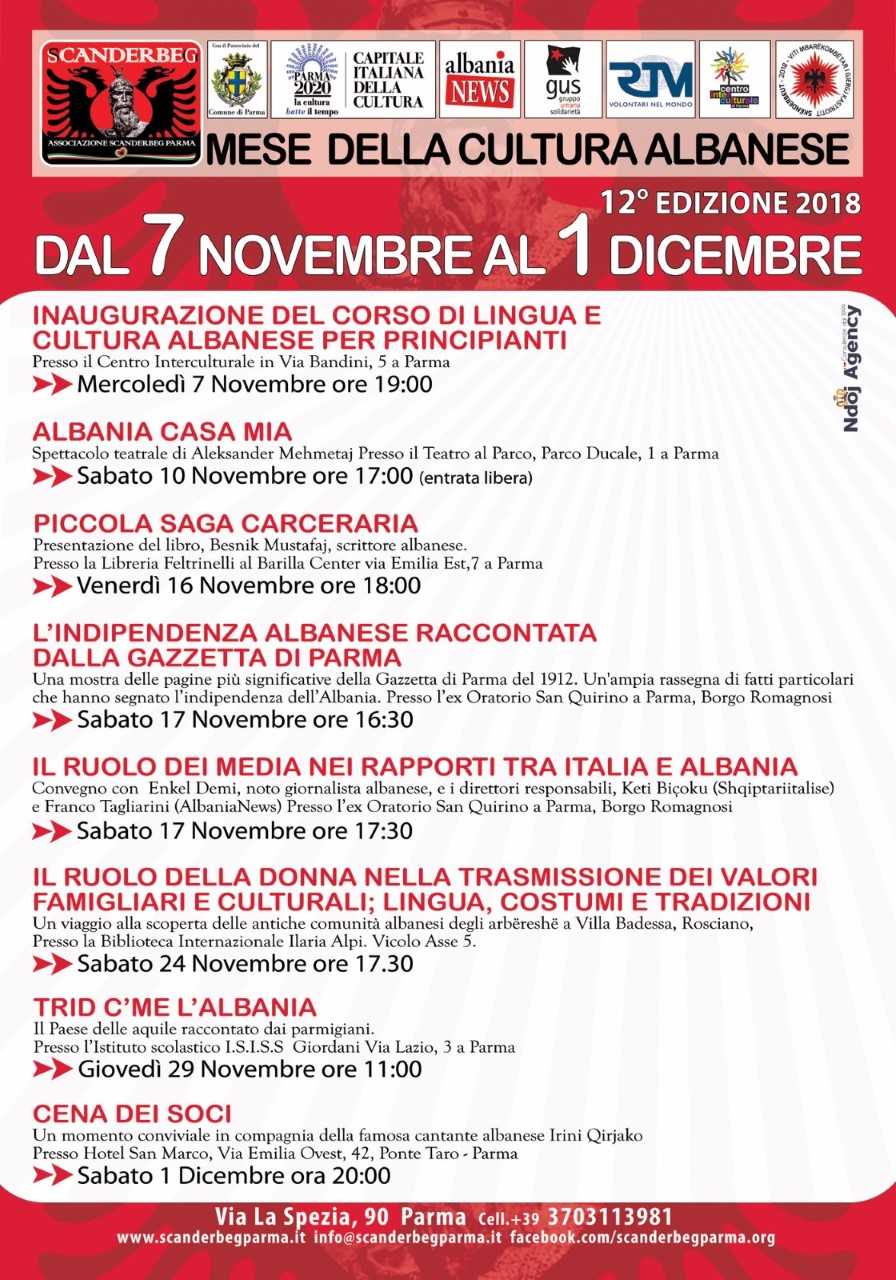 Organizzata dall’ associazione “Scanderbeg”, in occasione dell’anniversario dell’indipendenza albanese, sta per essere inaugurata la XII edizione del Mese della Cultura Albanese di Parma. L’associazione “Scanderbeg” promuove un fitto programma che vuole far conoscere la storia, la cultura e le tradizioni del “Paese delle Aquile” a Parma attraverso la condivisione di momenti letterari, storici e di festa.  L’iniziativa vede il patrocino del Comune di Parma e il coinvolgimento, del Centro Interculturale di Parma, di Gus – Gruppo Umana Solidarietà, RTM regio terzo mondo.
