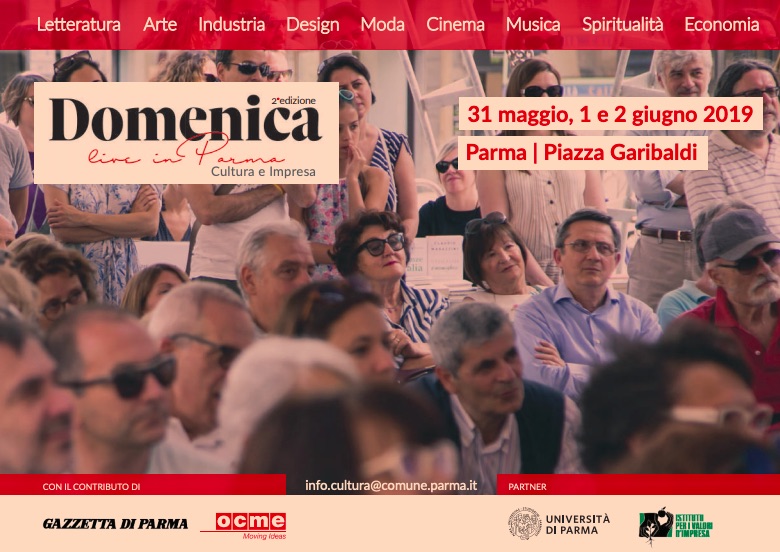 Al via venerdì 31 maggio la seconda edizione di Domenica – Live in Parma, la rassegna di incontri organizzata dall’assessorato alla Cultura del Comune di Parma in collaborazione con la Domenica de Il Sole 24 Ore, quest’anno dedicata al rapporto tra Cultura e Impresa, declinato in vari ambiti: dalla letteratura all’arte, dall’industria al design, dalla moda al cinema, dalla musica alla spiritualità fino all’economia.