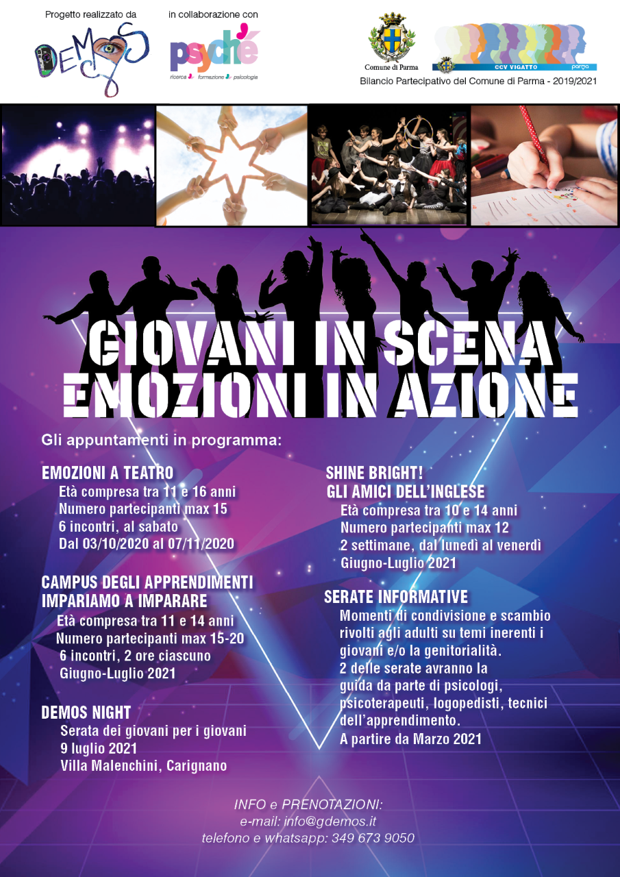 Sabato 26 settembre il primo appuntamento di “Emozioni a Teatro”. Gli incontri si svolgeranno sempre di sabato pomeriggio per tutto il mese di ottobre e sono rivolti ai ragazzi della scuola secondaria di secondo grado, impegnati nella sperimentazione delle proprie emozioni a livello corporeo e vocale. Un nuovo ciclo di proposte verrà avviato in estate proponendo laboratori di apprendimento e iniziative rivolte alla cittadinanza e alla serata Demos Night, in cui i ragazzi si possono esibiranno in performance musicali ed artistiche.