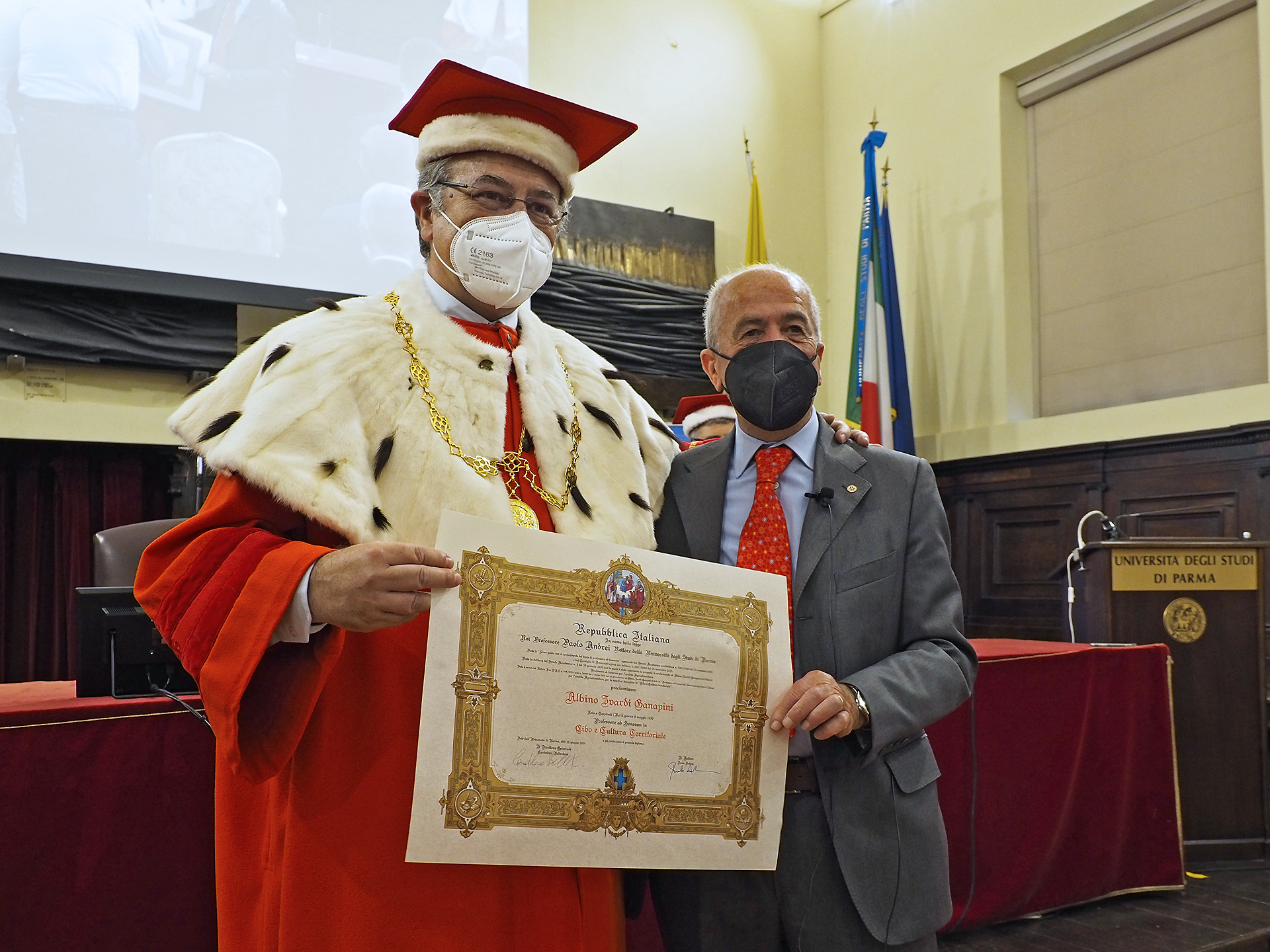 L’Università di Parma ha conferito il titolo ad Albino Ivardi Ganapini «per i preziosi contributi alla valorizzazione del territorio attraverso le risorse culturali, economiche e turistiche legate all’enogastronomia parmense, ma anche e soprattutto per aver rappresentato e per rappresentare tuttora, per tutti noi docenti e per tutti gli studenti del nostro Ateneo, un’ispirazione all’eccellenza nell’ambito della cultura agroalimentare», ha spiegato Daniele Del Rio, Presidente della Scuola di Studi Superiori in Alimenti e Nutrizione e docente di Nutrizione Umana, nel leggere la motivazione.