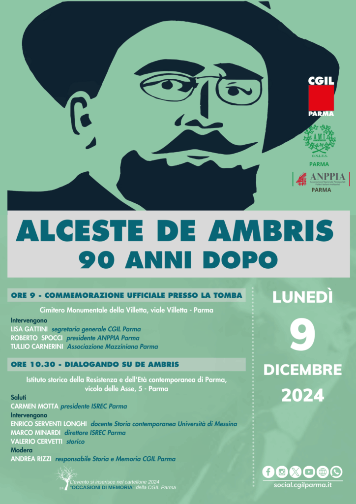 Un doppio appuntamento per ricordare Alceste De Ambris a 90 anni dalla scomparsa: il prossimo lunedì 9 dicembre, CGIL Parma, in collaborazione con ANPPIA e AMI provinciali, organizza, alle ore 9, la consueta commemorazione ufficiale al Cimitero della Villetta, presso il monumento funebre, alla presenza di Lisa Gattini, segretaria generale CGIL Parma, Roberto Spocci, presidente ANPPIA Parma, e Tullio Carnerini, dell’Associazione Mazziniana Parma.