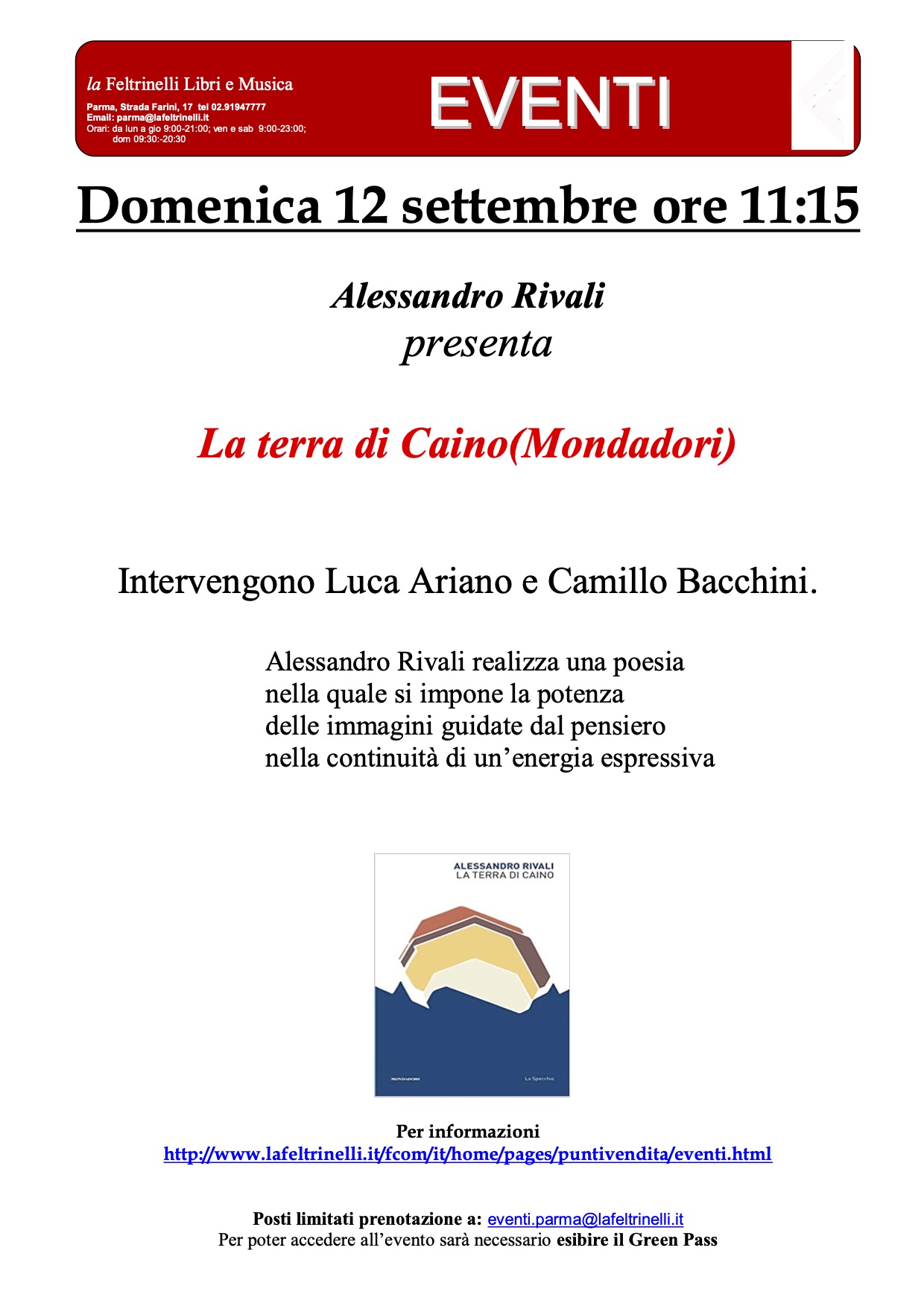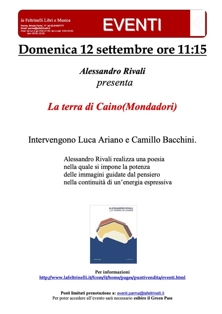 Alessandro Rivali presenta “la terra di Caino” di UG 8 Settembre 2021 8 Settembre 2021 149 Il 12 Settembre alle ore 11.15 presso la Libreria Feltrinelli di Parma si terrà l’evento con Alessandro Rivali e il suo libro La terra di Caino (Mondadori). Prenotazione obbligatoria e Green Pass.