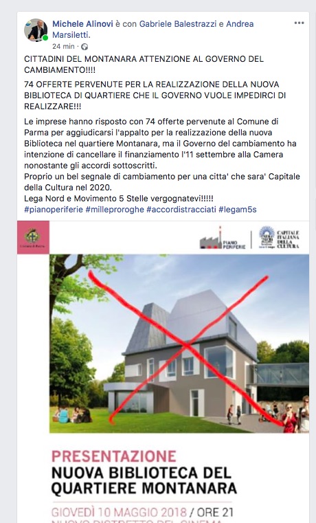 Non usa mezzi termini l’assessore ai lavori pubblici del Comune di Parma Michele Alinovi in merito al taglio delle risorse destinate alla riqualificazione delle periferie. Scrive su Facebook: “Cittadini del Montanara attenzione al Governo del Cambiamento!