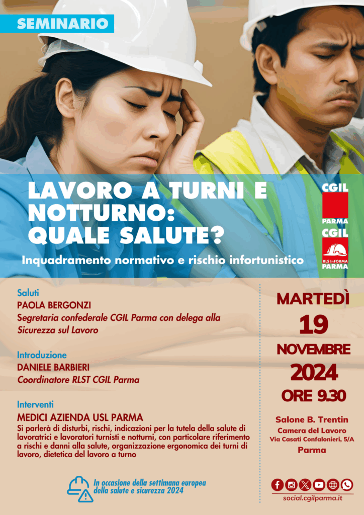 In occasione della Settimana europea della salute e sicurezza sul lavoro Cgil Parma e il suo staff Rlst organizzano un seminario di approfondimento sul tema “Lavoro a turni e notturno: Quale salute? Inquadramento normativo e rischio infortunistico” per martedì 19 novembre, alle 9.30, nel salone Trentin della Camera del Lavoro di Parma, in via Casati Confalonieri, 5/A.