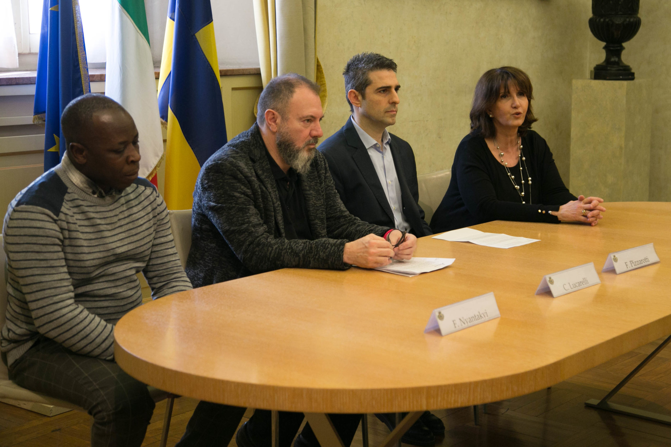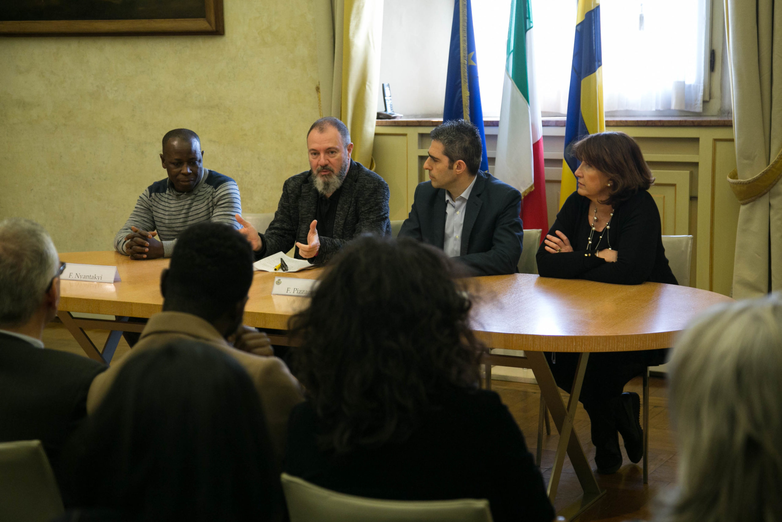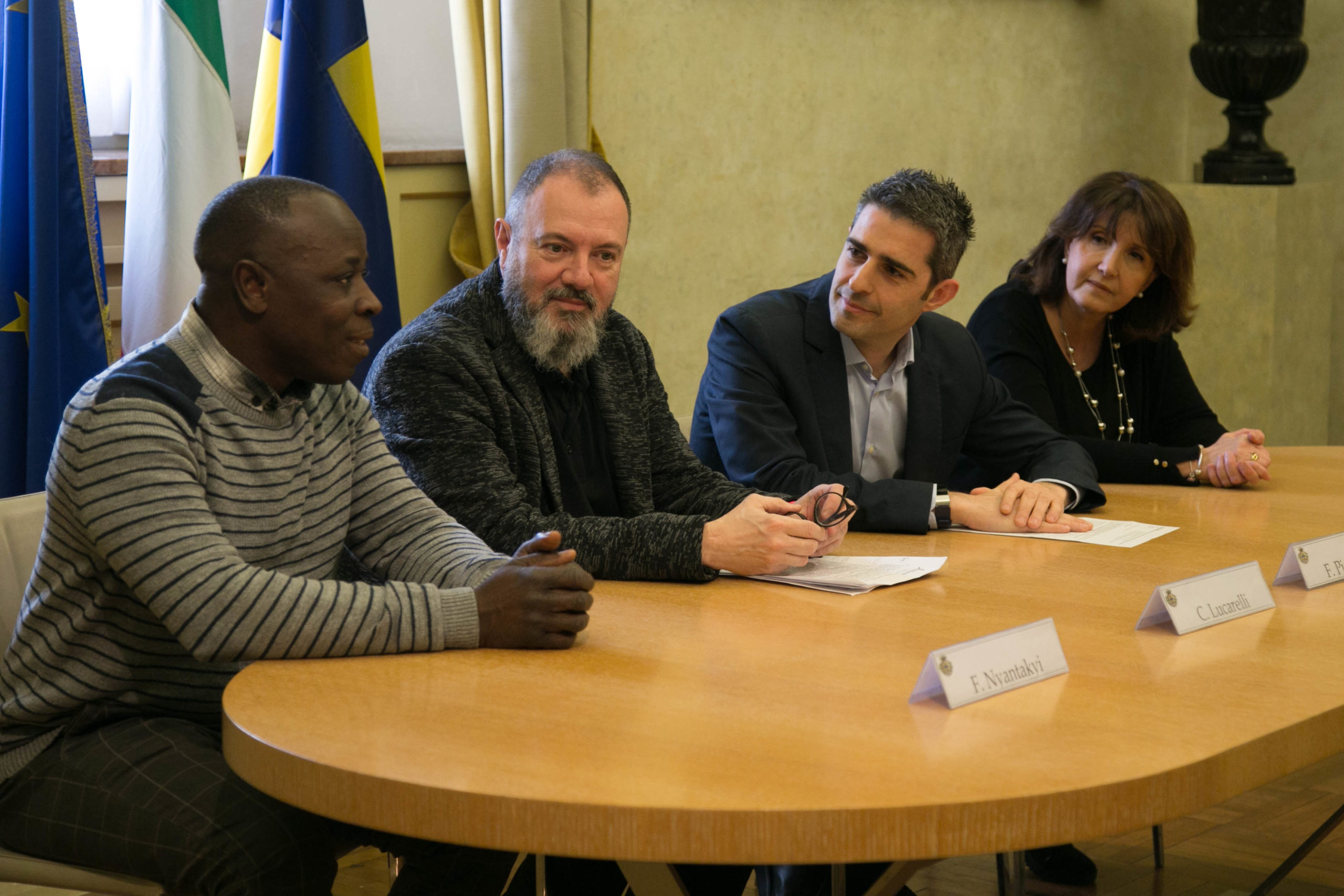 Nella sala di rappresentanza del Comune di Parma Carlo Lucarelli, presidente della Fondazione Emiliano-Romagnola Vittime di reato, insieme al sindaco Federico Pizzarotti e all’assessora Nicoletta Paci hanno incontrato Fred Nyantakyi e il figlio maggiore Raymond.