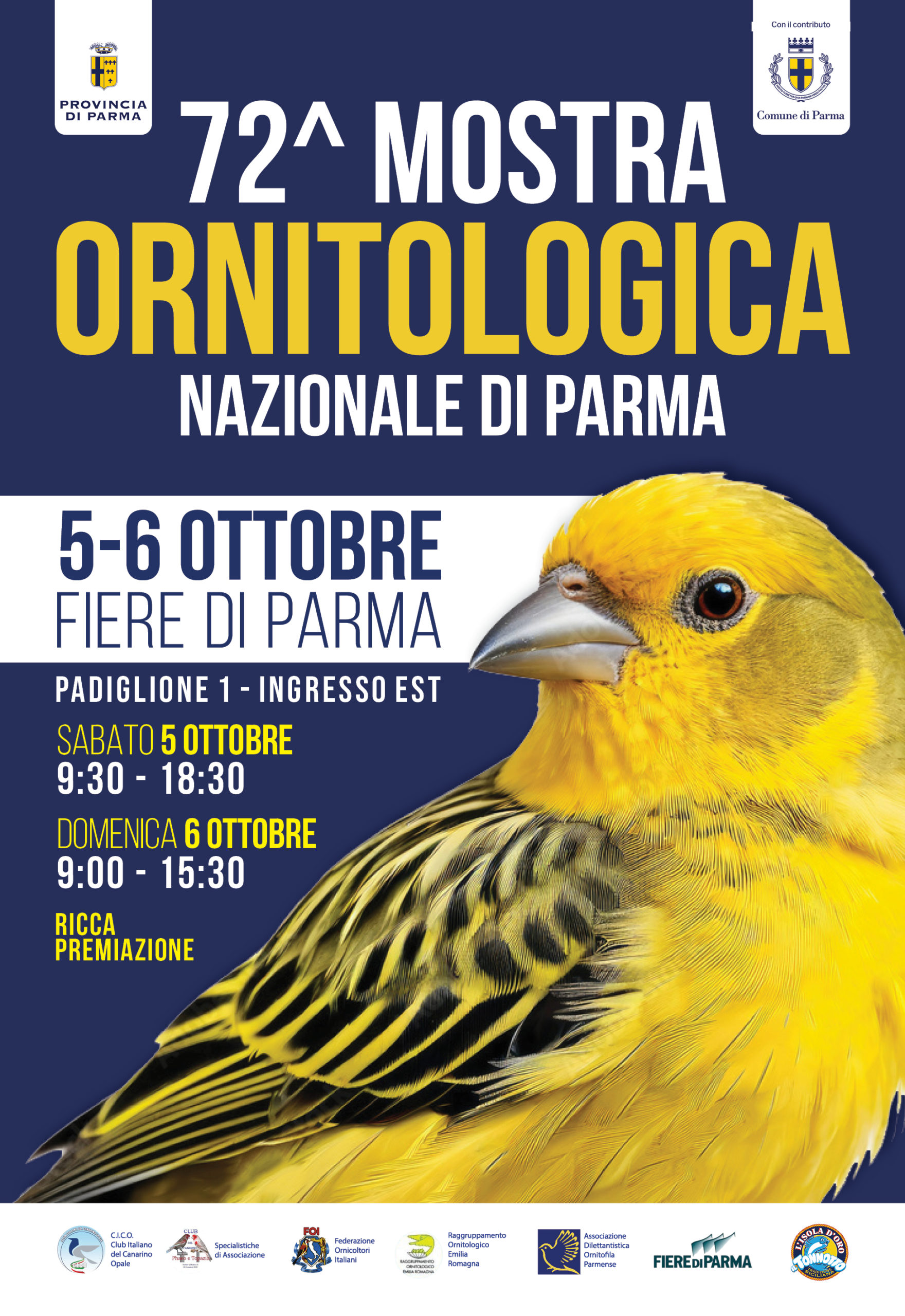 L’Associazione Dilettantistica Ornitofila Parmense (A.D.O.P.) organizza a Fiere di Parma nelle giornate di sabato 5 e domenica 6 ottobre la 72a mostra nazionale di ornitologia, con il patrocinio di Comune e Provincia di Parma.