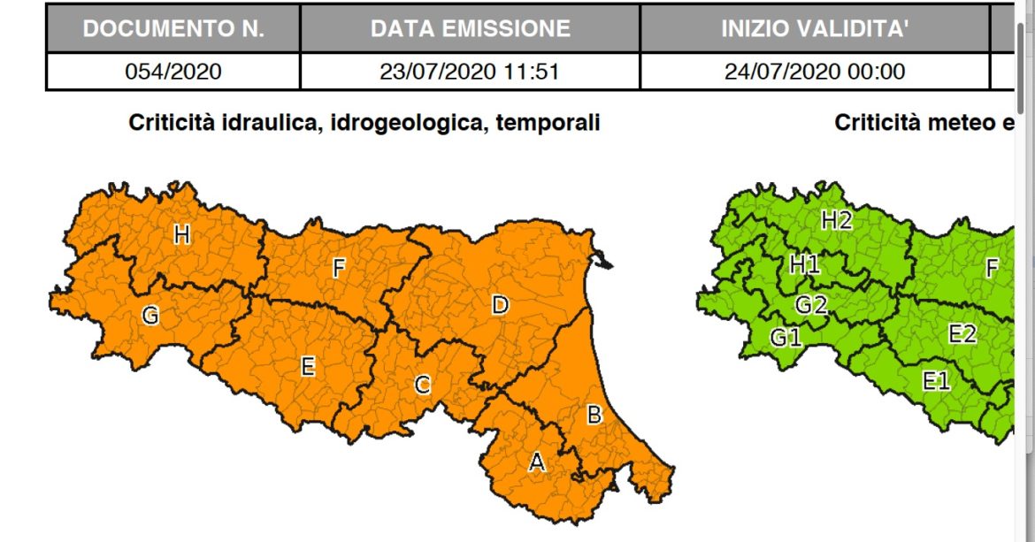 La Protezione civile ha emesso allerta n. 54/2020 che interesserà il territorio emiliano romagnolo dalla mezzanotte di oggi 23 luglio alla mezzanotte di venerdì 24 luglio.