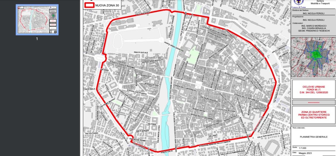 Il Comune di Parma comunica l’istituzione di una zona con limite di velocità dei 30 km/h nell’area compresa all’interno dei viali di circonvallazione e nello specifico: Strade comprese all’interno dell’area delimitata da p.le S. Croce, v.le Pasini, v.le Piacenza, v.le Bottego, v.le Mentana, p.le Vittorio Emanuele II, v.le S. Michele, s.ne Martiri della Libertà, v.le Berenini, v.le Caprera, p.le Barbieri, v.le Vittoria (planimetria in allegato).