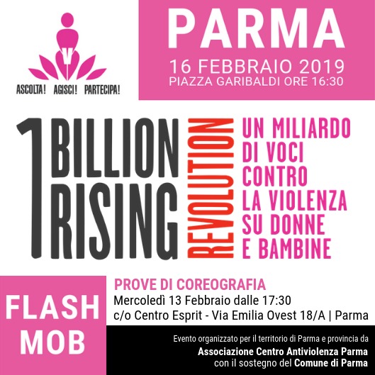 Sabato 16 febbraio, alle 16.30, in Piazza Garibaldi, appuntamento con One Billion Rising, Flash Mob organizzato dal Centro Antiviolenza di Parma con il sostegno del Comune di Parma.