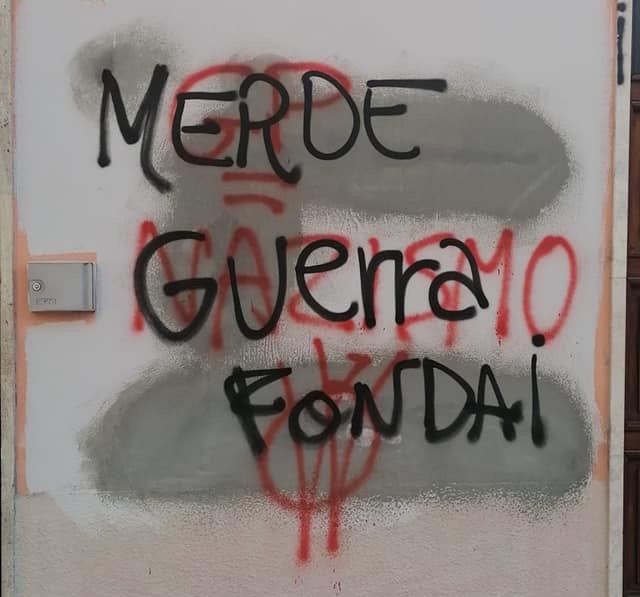 Qualche giorno fa i muri erano stati imbrattati accusando il Pd di nazismo per il Green Pass, questa notte scritta in nero con l’accusa di essere un partito “guerra fondai”.