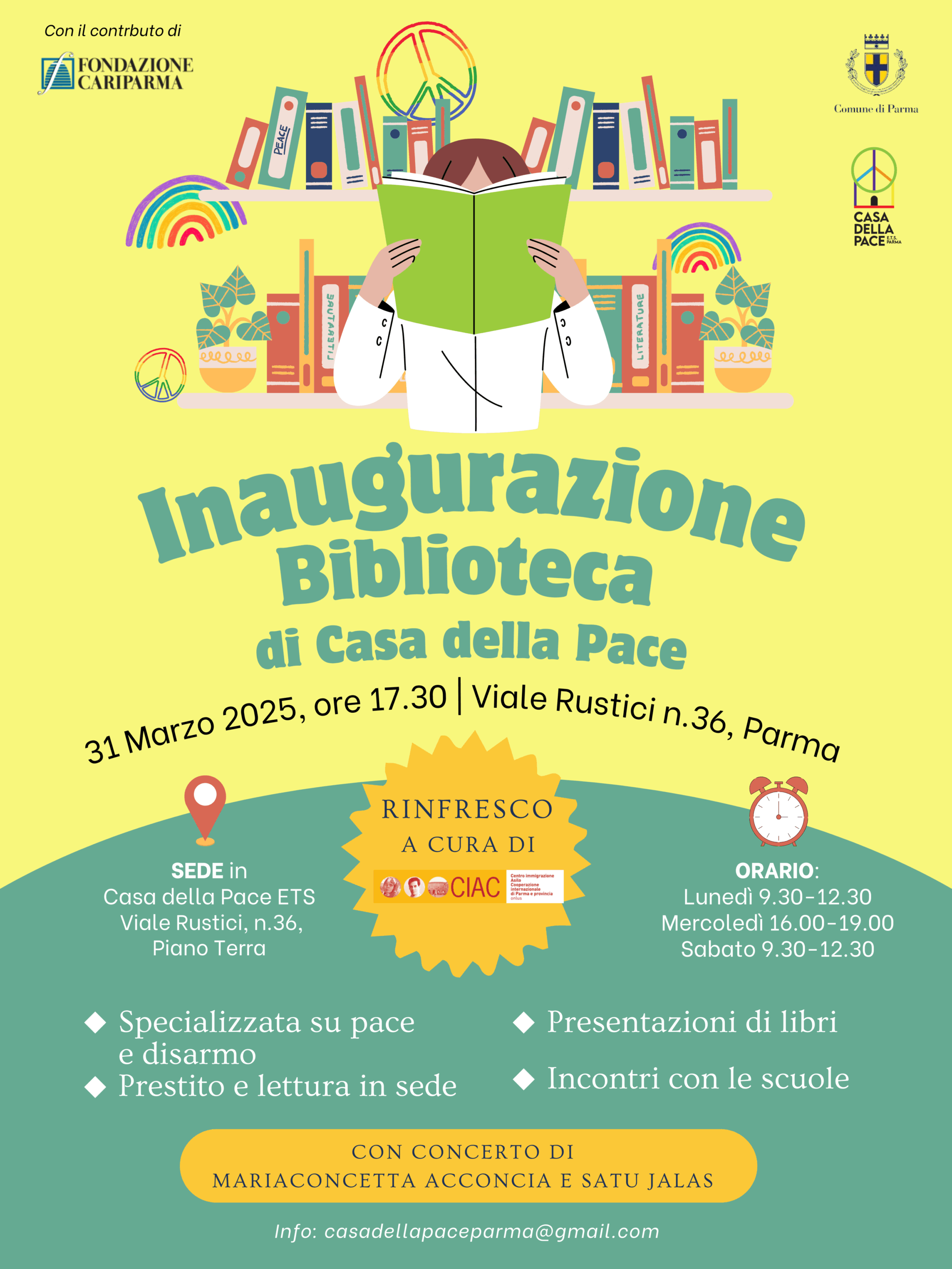 Lunedì 31 marzo alle ore 17.30 è in programma l’inaugurazione della nuova biblioteca dell’Associazione Casa della Pace ETS, nella storica sede di viale Rustici n.36 a Parma.