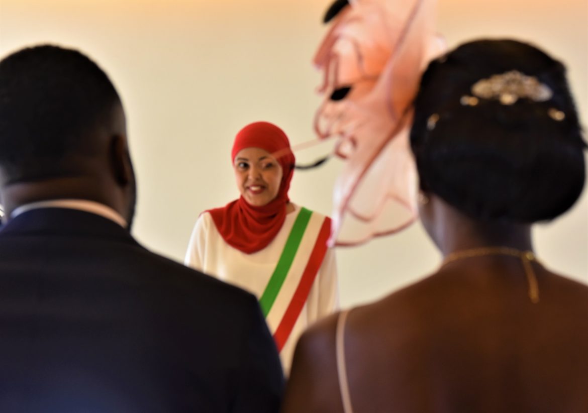 E’ stato il “Milolo” , l’urlo gioioso per le spose del Congo, cantato delle sue invitate, ad accogliere l’entrata nella Palazzina Eridania di Arianna fasciata nel suo abito di pizzo rosa. La celebrante è stata, invece, la parmigiana-marocchina Nabila-Mahidra, consigliera comunale, al suo primo rito officiato come delegata del Comune.