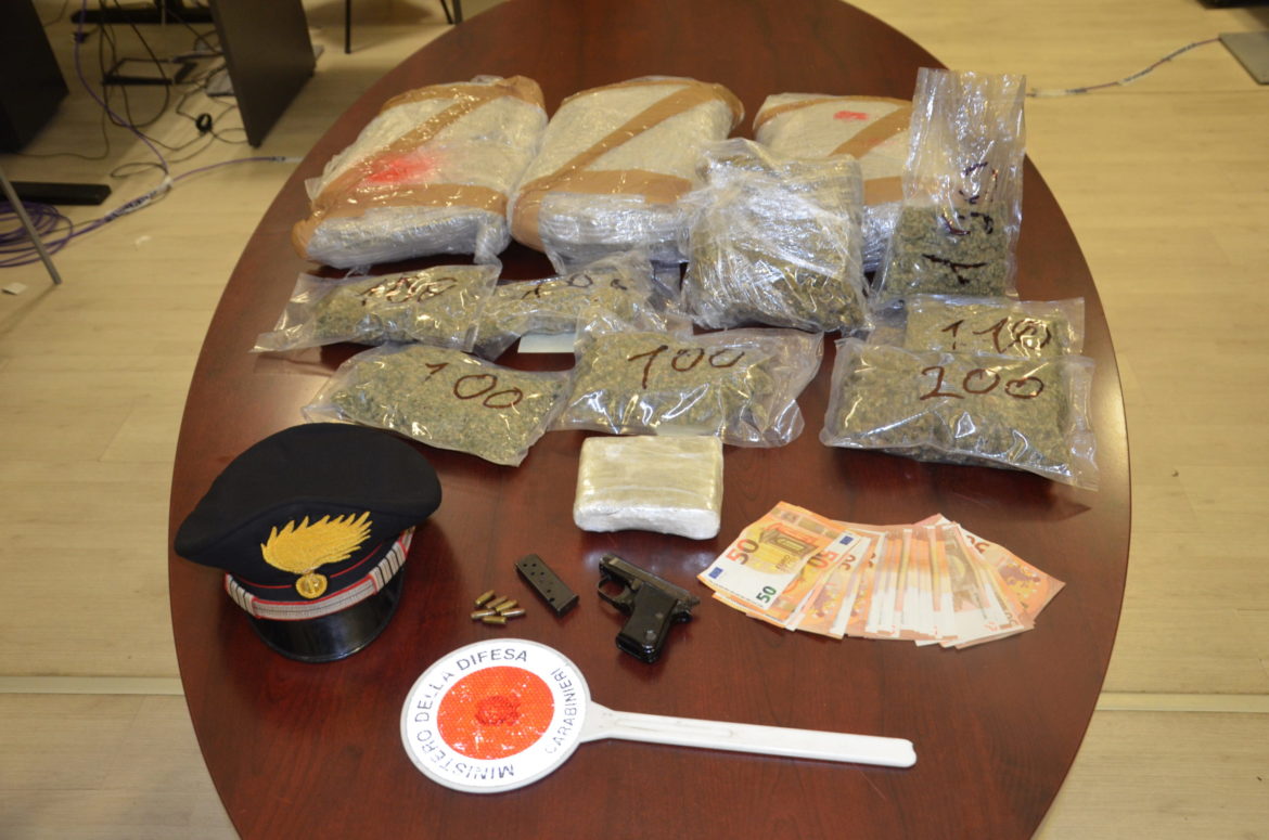 A seguito del ritrovamento dell’ingente quantitativo si perquisiva l’abitazione della coppia a Medesano dove, in diversi borsoni appoggiati sul pavimento della camera da letto si sequestravano oltre quattro chili e mezzo di marijuana suddivisi in diversi pacchi termosaldati. La perquisizione consentiva di rinvenire, all’interno del comodino, una pistola Beretta con caricatore inserito completo di 6 colpi rubata in provincia di Reggio Emilia nel 2020 ed un bilancino di precisione con capacità di peso di 2kg.  La cocaina, dai preliminari accertamenti tecnici, è risultata avere un elevato grado di purezza e una volta “tagliata” avrebbe permesso di immettere sul “mercato” oltre 1000 dosi per un valore stimato di circa 75.000 euro mentre la marijuana avrebbe fruttato circa 10000 dosi per un valore di circa 45 mila euro.