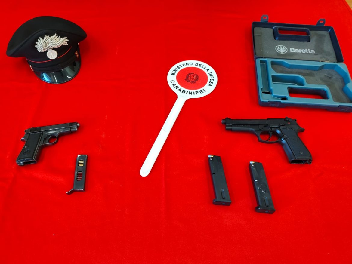 Durante le ricerche, sotto il sedile anteriore lato destro veniva rinvenuto un marsupio con i documenti d’identità del conducente del veicolo, ma anche due pistole, una Beretta calibro 9X21 modello FS, perfettamente funzionante, con due caricatori, uno inserito completo di 13 munizioni inserito e l’altro con 2 munizioni ed un’altra Beretta calibro 7,65 modello 35 con matricola abrasa con caricatore inserito contenente 4 munizioni.