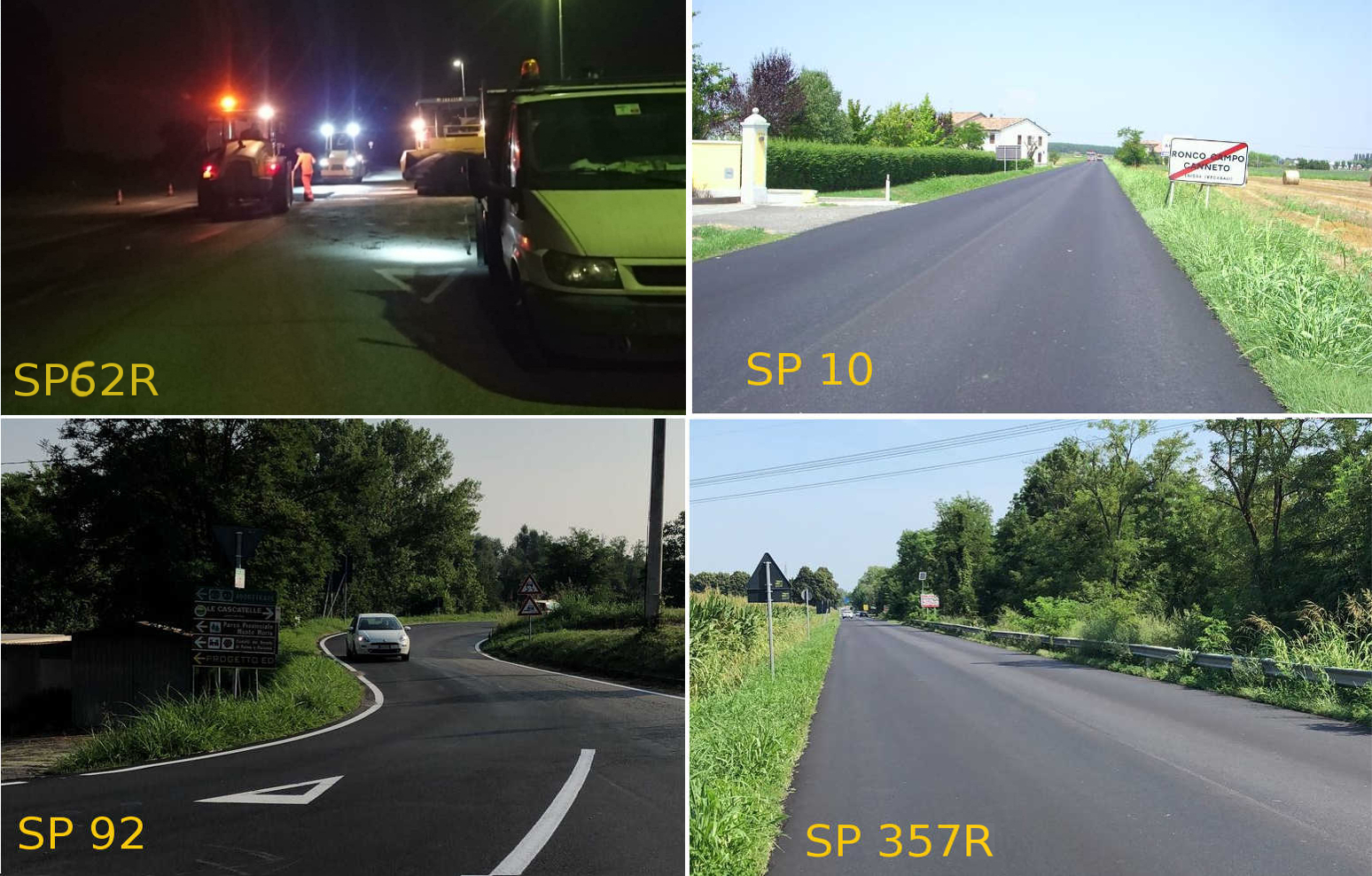 Nella foto, in senso orario: SP.62R della Cisa in comune di Sorbolo, SP.10 di Cremona a Ronco Campo Canneto, SP.357R di Fornovo tra Noceto e Medesano, SP.92 San Nicomede in zona Salsomaggiore.